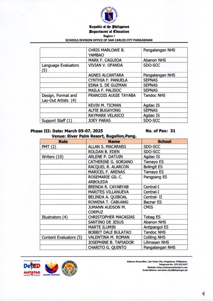 • Division Memorandum No. 070 s, 2026 – CONDUCT OF ONSITE VALIDATION FOR THE SEARCH FOR THE MOST OUTSTANDING SCHOOL-BASED FEEDING PROGRAM (SBFP) IMPLEMENTERS FOR SY 2025-2026, SEARCH FOR THE MOST FUNCTIONAL GULAYAN SA PAARALAN PROGRAM (GPP) IMPLEMENTERS FOR SY 2025-2026, AND PROGRESS MONITORING FOR CANTEEN OPERATIONS