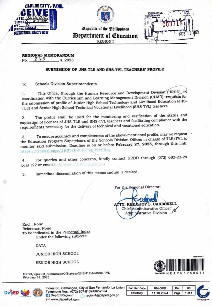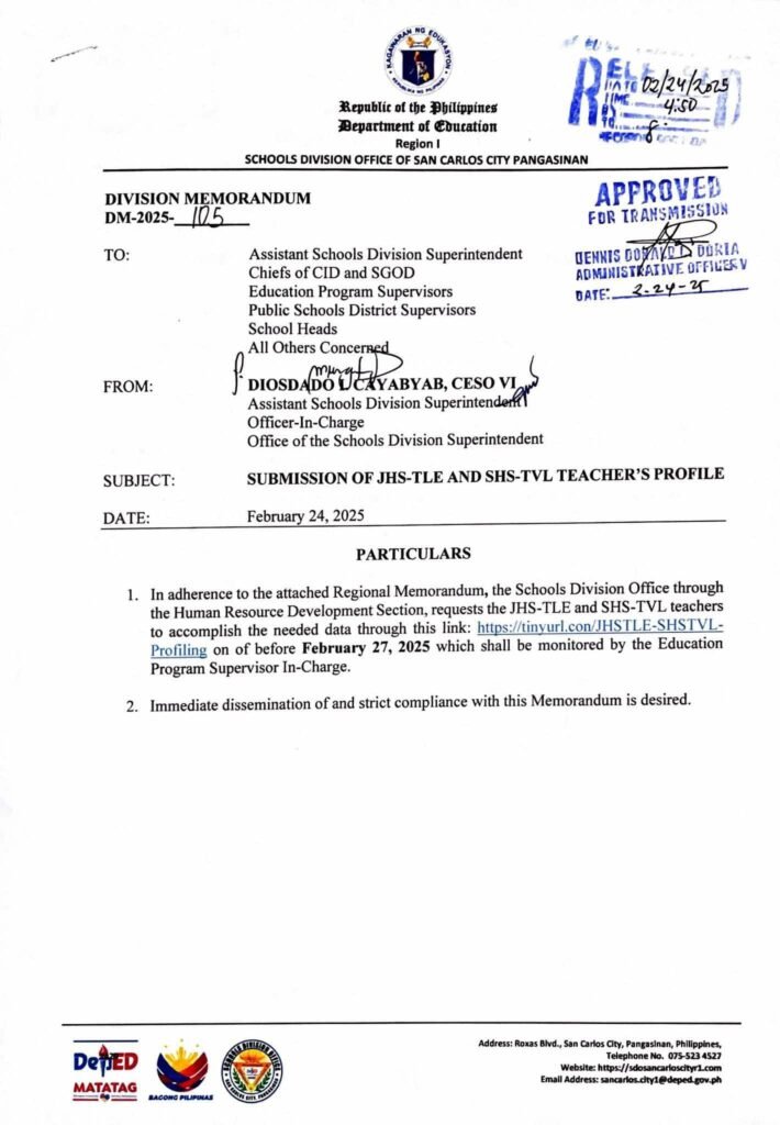 Division Memorandum No. 105 s, 2025 – SUBMISSION OF JHS-TLE AND SHS-TVL TEACHER’S PROFILE
