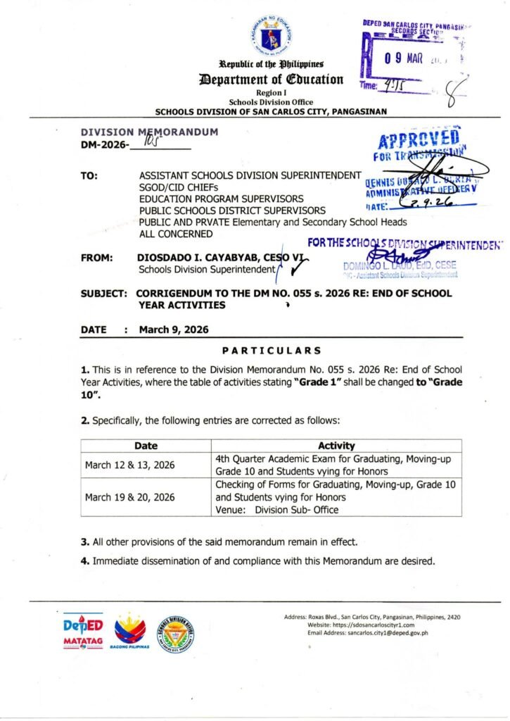 Division Memorandum No. 105 s, 2026 – CORRIGENDUM TO THE DM NO. 055 S. 2026 RE: END OF SCHOOL YEAR ACTIVITIES