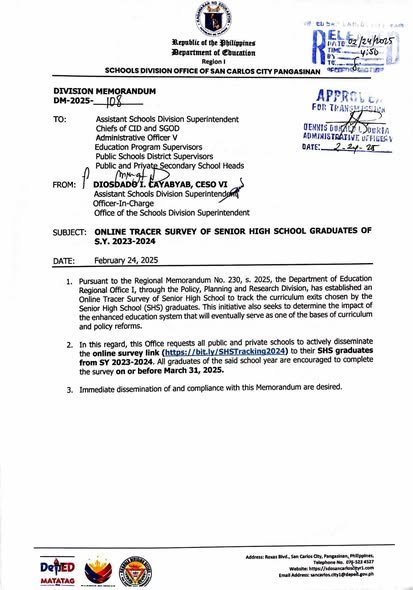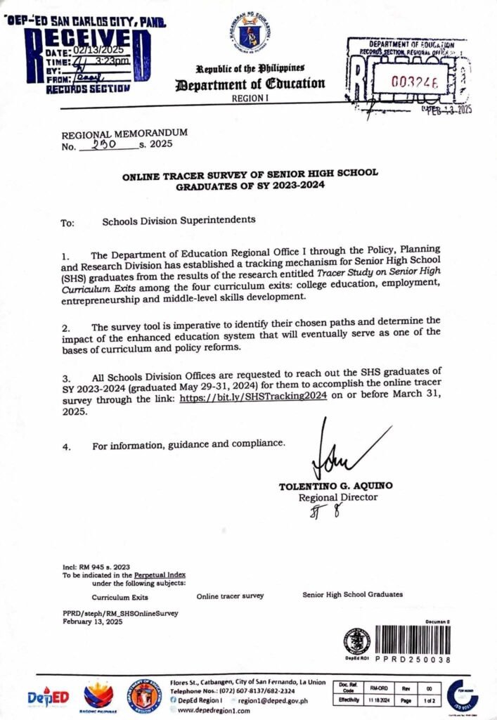 Division Memorandum No. 108 s, 2025 – ONLINE TRACER SURVEY OF SENIOR HIGH SCHOOL GRADUATES OF S.Y. 2023-2024