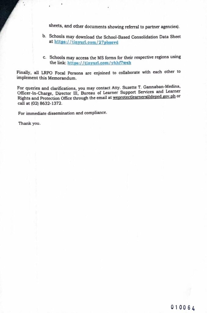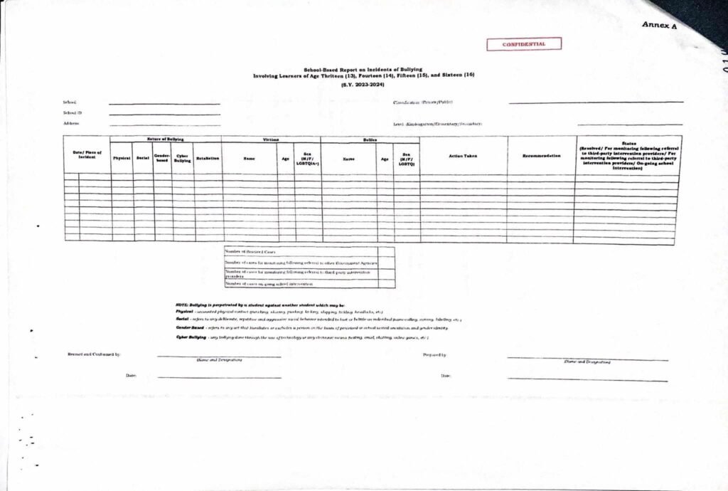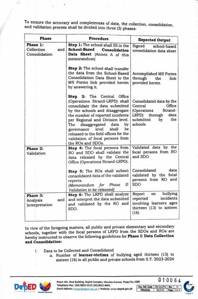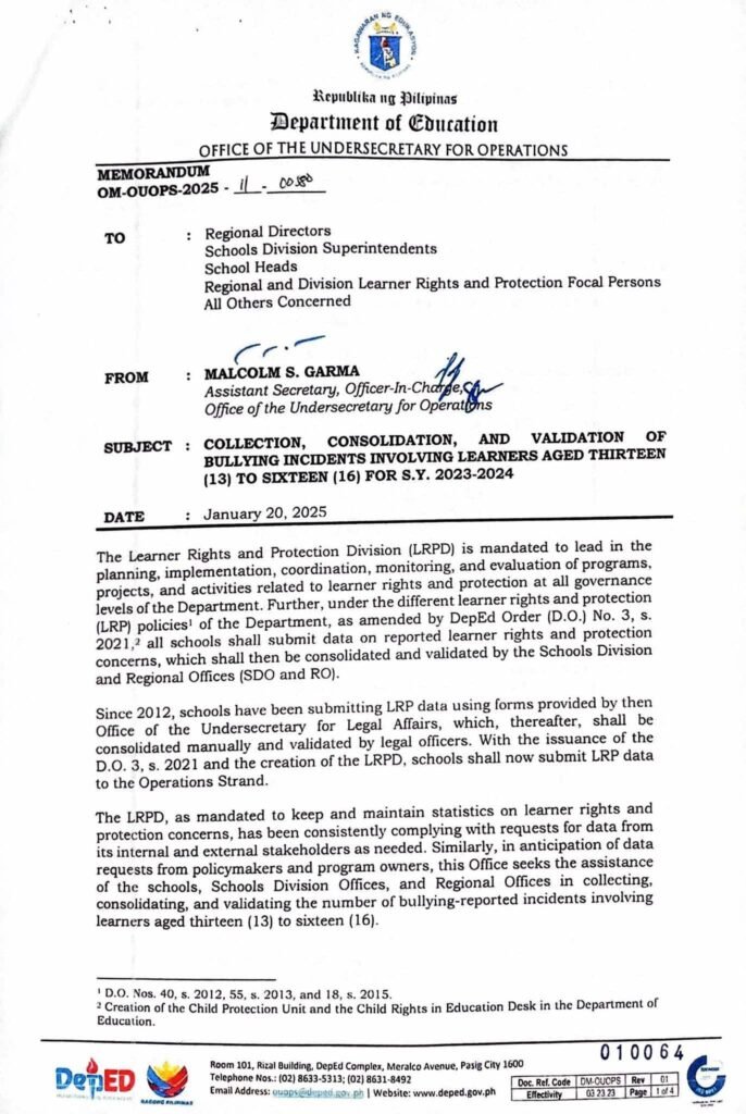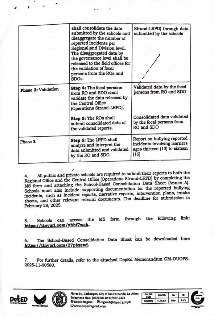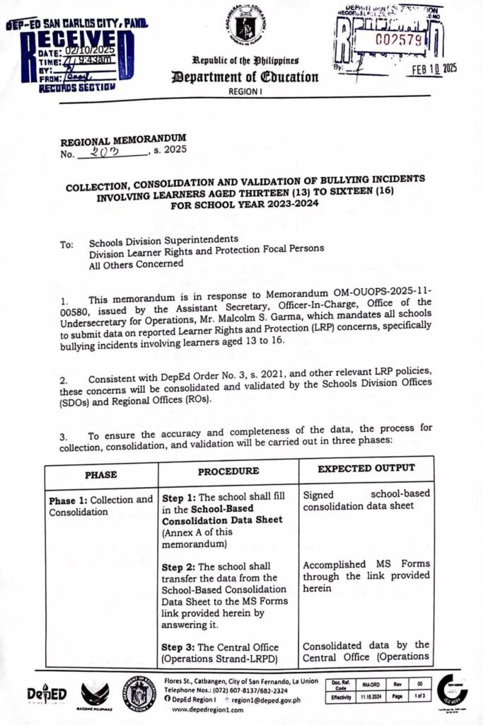 Division Memorandum No. 109 s, 2025 – COLLECTION, CONSOLIDATION, AND VALIDATION FOR BULLYING INCIDENT INVOLVING LEARNERS AGED THIRTEEN (13) TO SIXTEEN (16) FOR SCHOOL YEAR 2023-2024