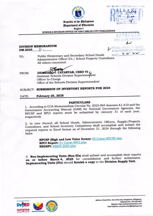 Division Memorandum No. 111 s, 2025 – SUBMISSION OF INVENTORY REPORTS FOR 2024 https://tinyurl.com/2024SDOSCCinventoryreport