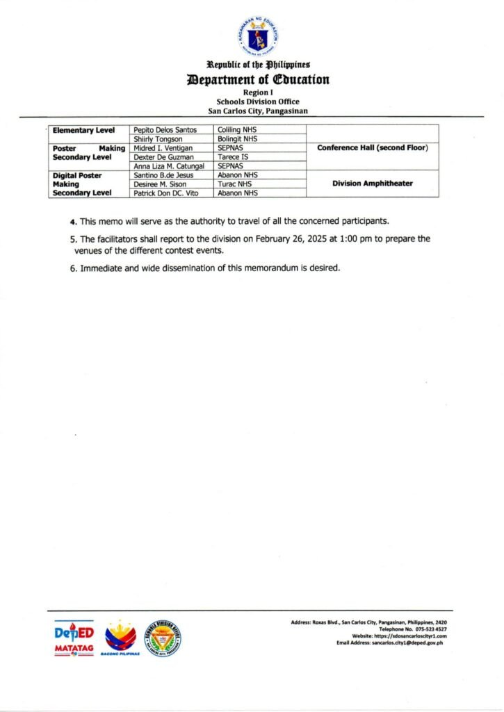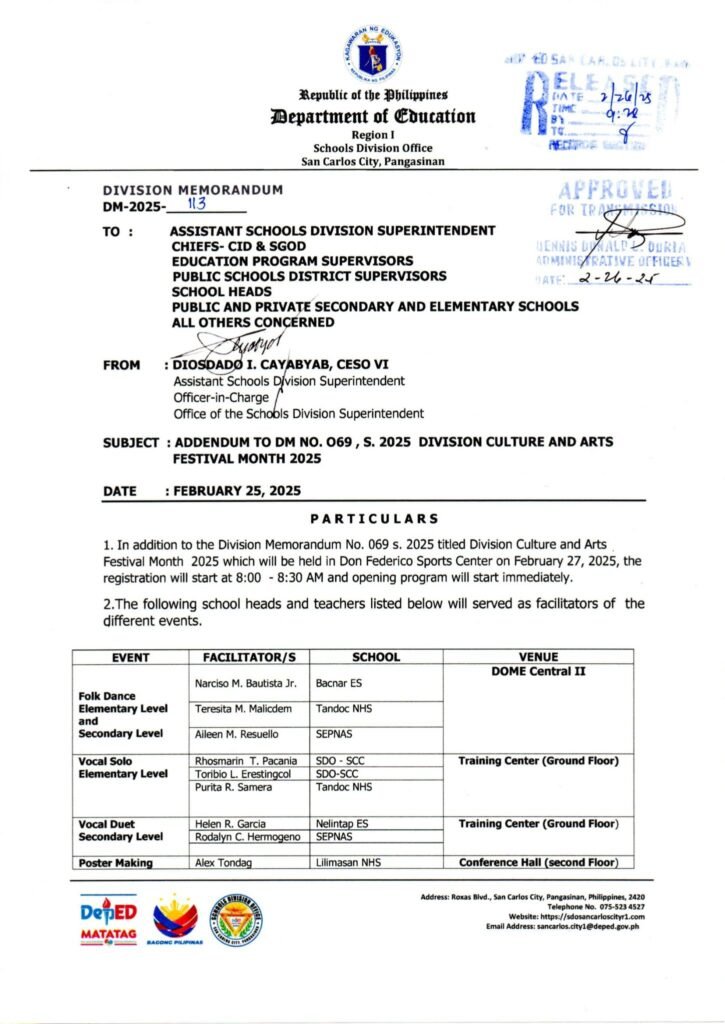 Division Memorandum No. 113 s, 2025 – ADDENDUM TO DM NO. 069, S. 2025 DIVISION CULTURE AND ARTS FESTIVAL MONTH 2025