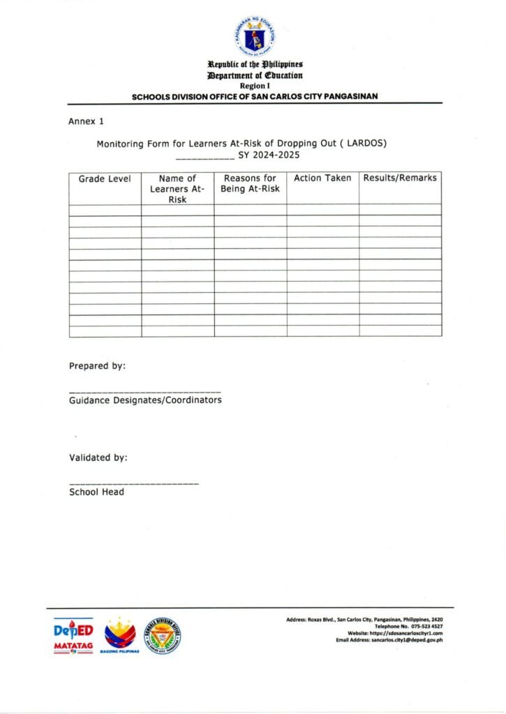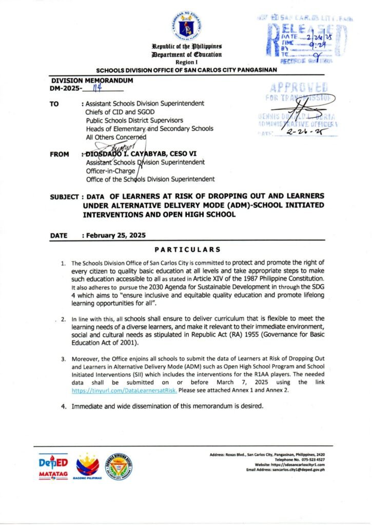 Division Memorandum No. 114 s, 2025 – DATA OF LEARNERS AT RISK OF DROPPING OUT AND LEARNERS UNDER ALTERNATIVE DELIVERY MODE (ADM)- SCHOOL INITIATED INTERVENTIONS AND OPEN HIGH SCHOOL