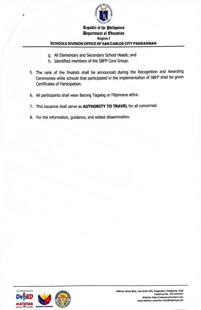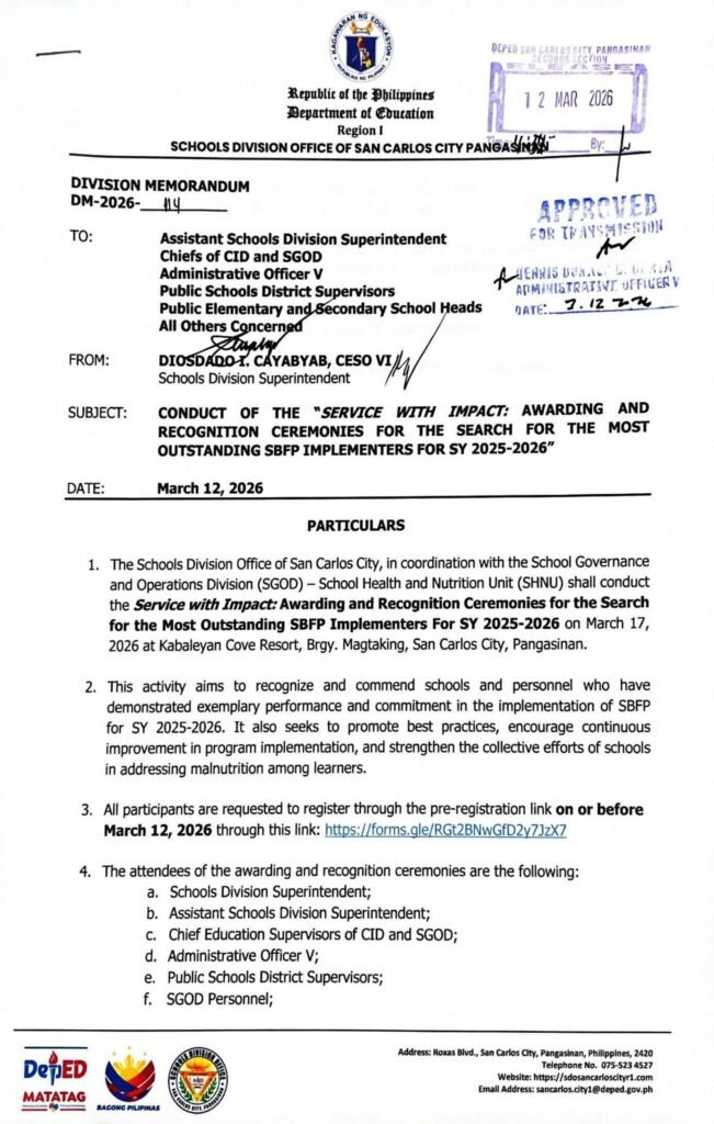 Division Memorandum No. 114 s, 2026 – CONDUCT OF THE ” SERVICE WITH IMPACT: AWARDING AND RECOGNITION CEREMONIES FOR THE SEARCH FOR THE MOST OUTSTANDING SBFP IMPLEMENTERS FOR SY 2025-2026″