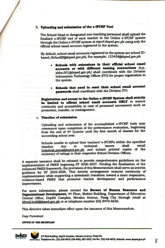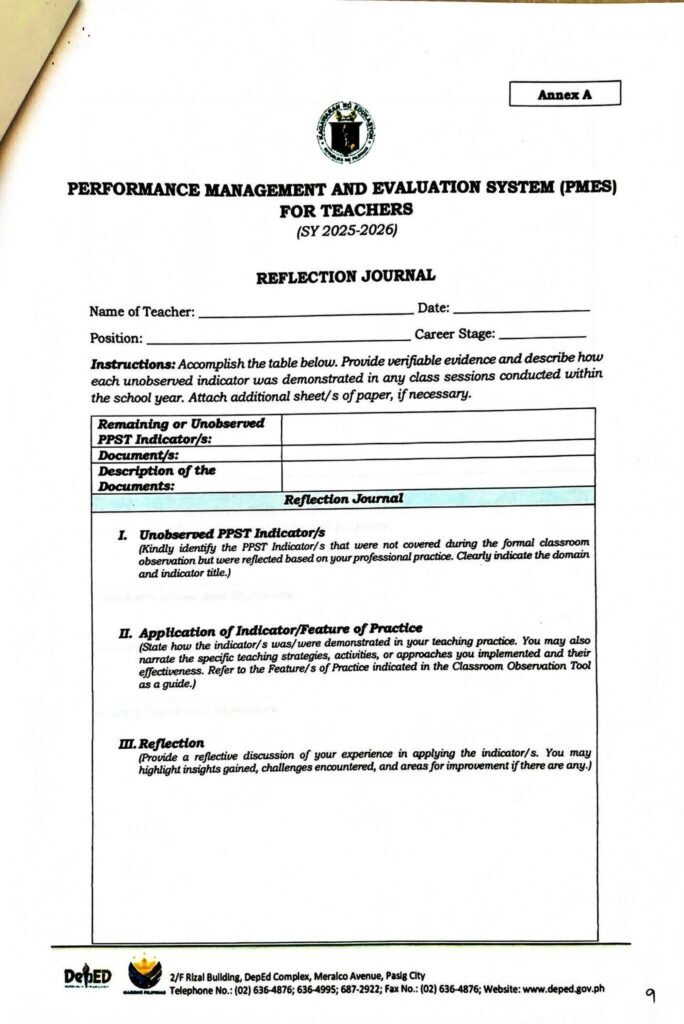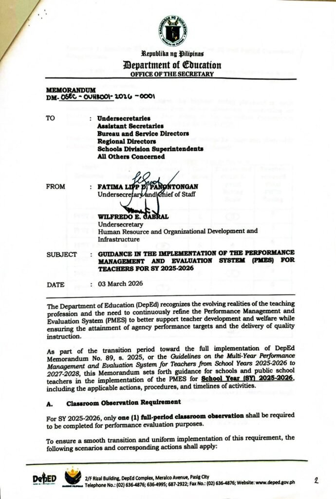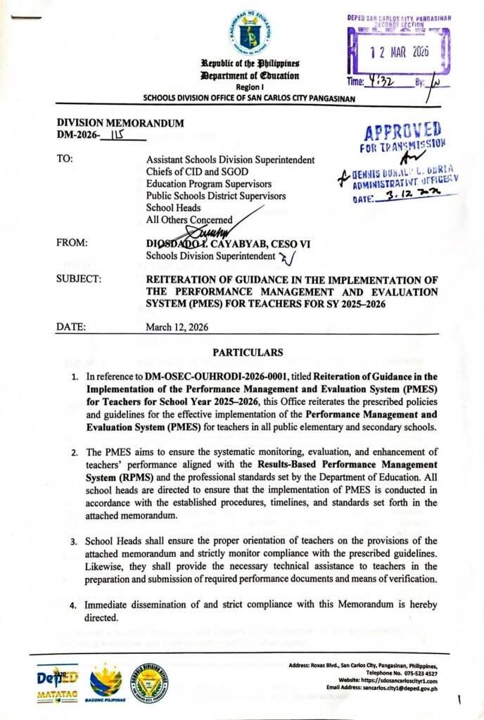 • Division Memorandum No. 115 s, 2026 – REITERATION OF GUIDANCE IN THE IMPLEMENTATION OF THE PERFORMANCE MANAGEMENT AND EVALUATION SYSTEM (PMES) FOR TEACHERS FOR SY 2025-2026