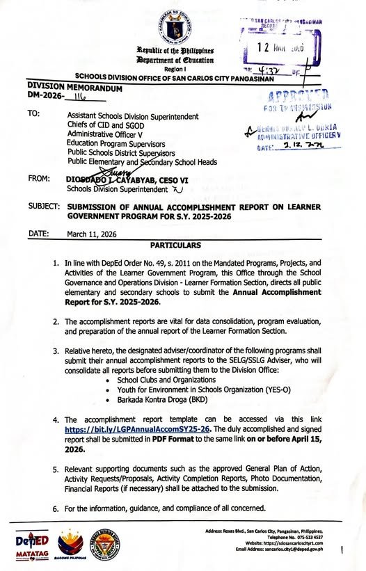• Division Memorandum No. 116 s, 2026 – SUBMISSION OF ANNUAL ACCOMPLISHMENT REPORT ON LEARNER GOVERNMENT PROGRAM FOR SY 2025-2026