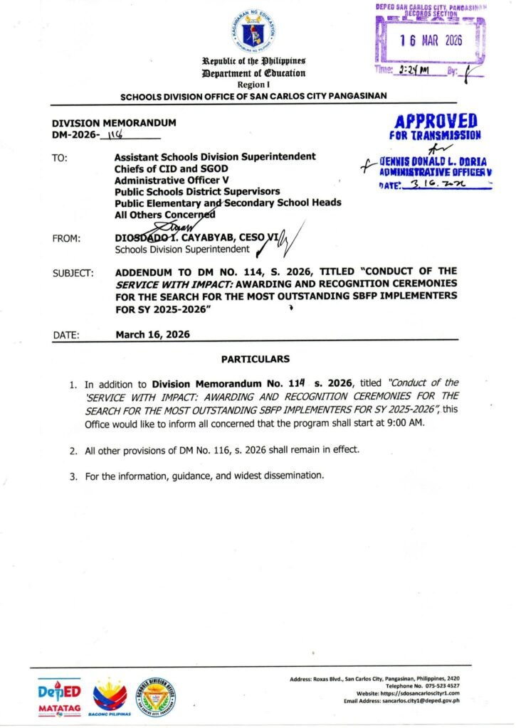 • Division Memorandum No. 118 s, 2026 – ADDENDUM TO DM NO. 114 S. 2026, TITLED “CONDUCT OF THE “SERVICE WITH IMPACT: AWARDING AND RECOGNITION CEREMONIES FOR THE SEARCH FOR THE MOST OUTSTANDING SBFP IMPLEMENTERS FOR SY 2025-2026”