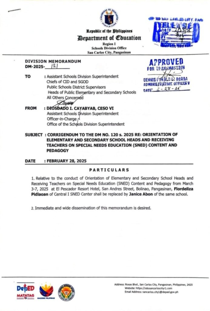 Division Memorandum No. 121 s, 2025 – Corrigendum to the DM No. 120 s. 2025 RE: Orientation of Elementary and Secondary School Heads and Receiving Teachers on Special Needs Education (SNED) Content and Pedagogy