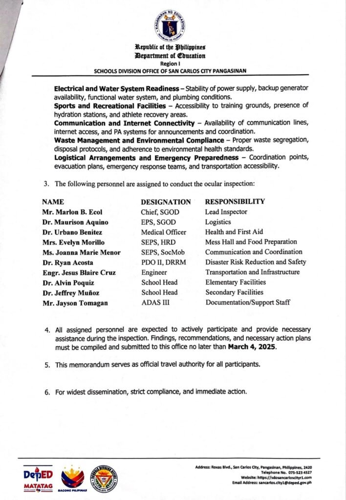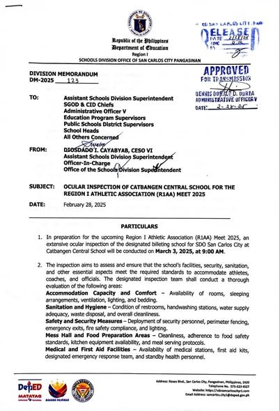 Division Memorandum No. 123 s, 2025 – OCULAR INSPECTION OF CATBANGEN CENTRAL SCHOOL FOR THE REGION 1 ATHLETIC ASSOCIATION (R1AA) MEET 2025