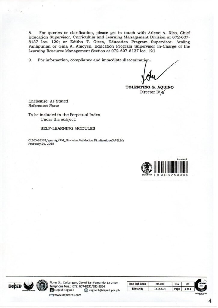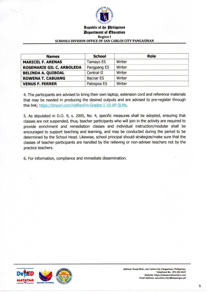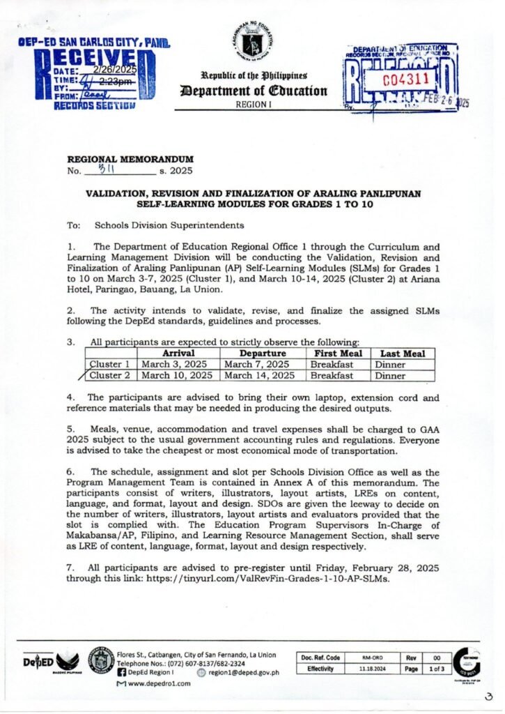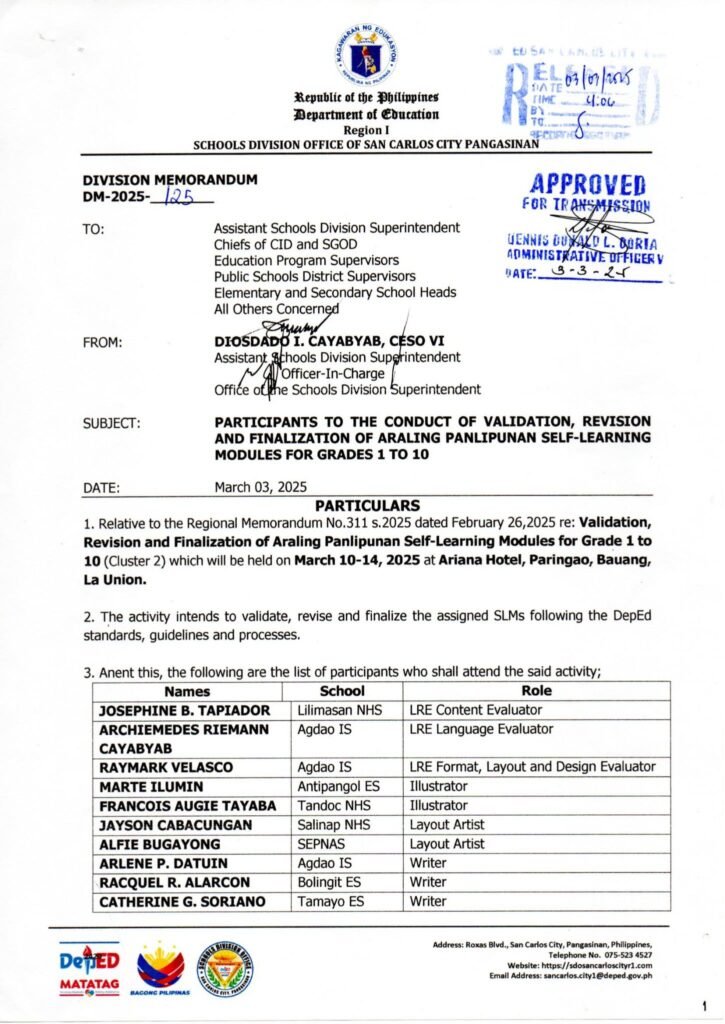 Division Memorandum No. 125 s, 2025 – PARTICIPANTS TO THE TO THE CONDUCT OF VALIDATION, REVISION AND FINALIZATION OF ARALING PANLIPUNAN SELF-LEARNING MODULES FOR GRADE 1 TO 10