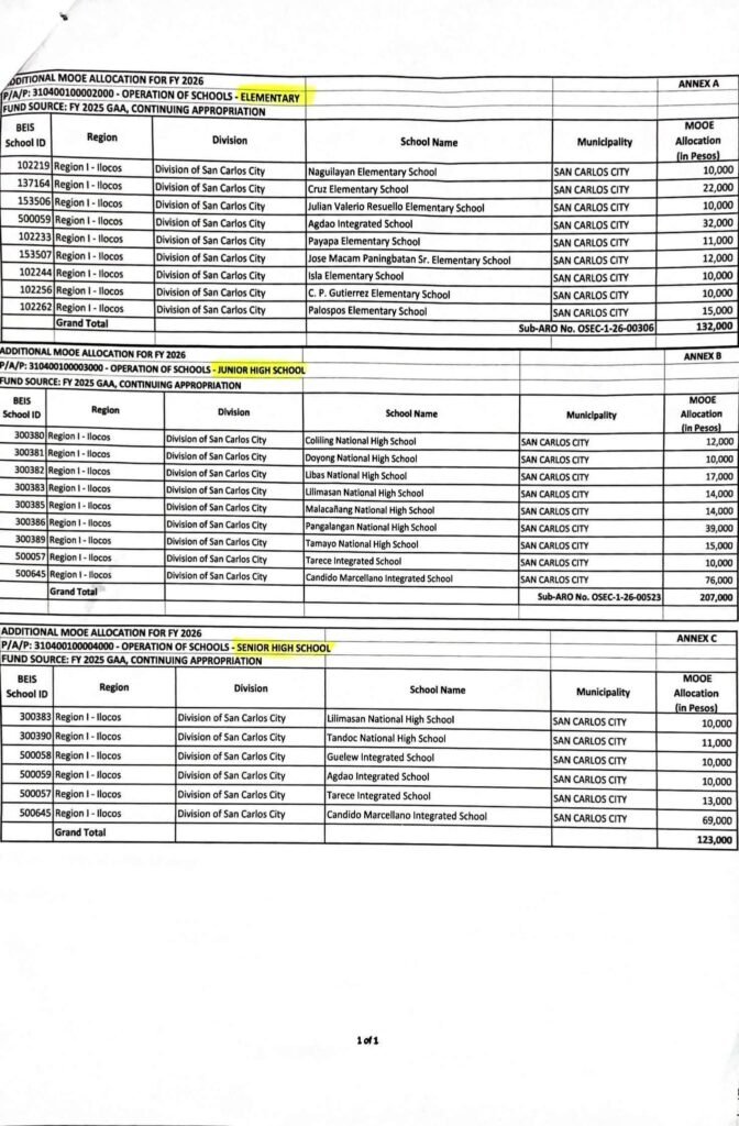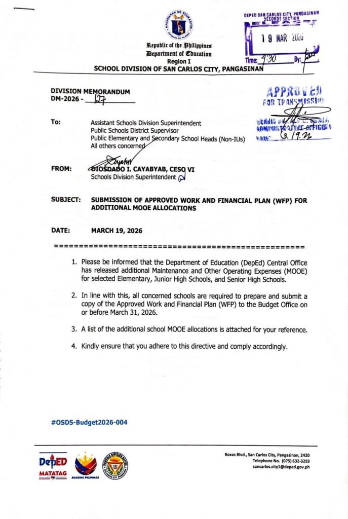 • Division Memorandum No. 127 s, 2026 – SUBMISSION OF APPROVED WORK AND FINANCIAL PLAN (WFP) FOR ADDITIONAL MOOE ALLOCATIONS