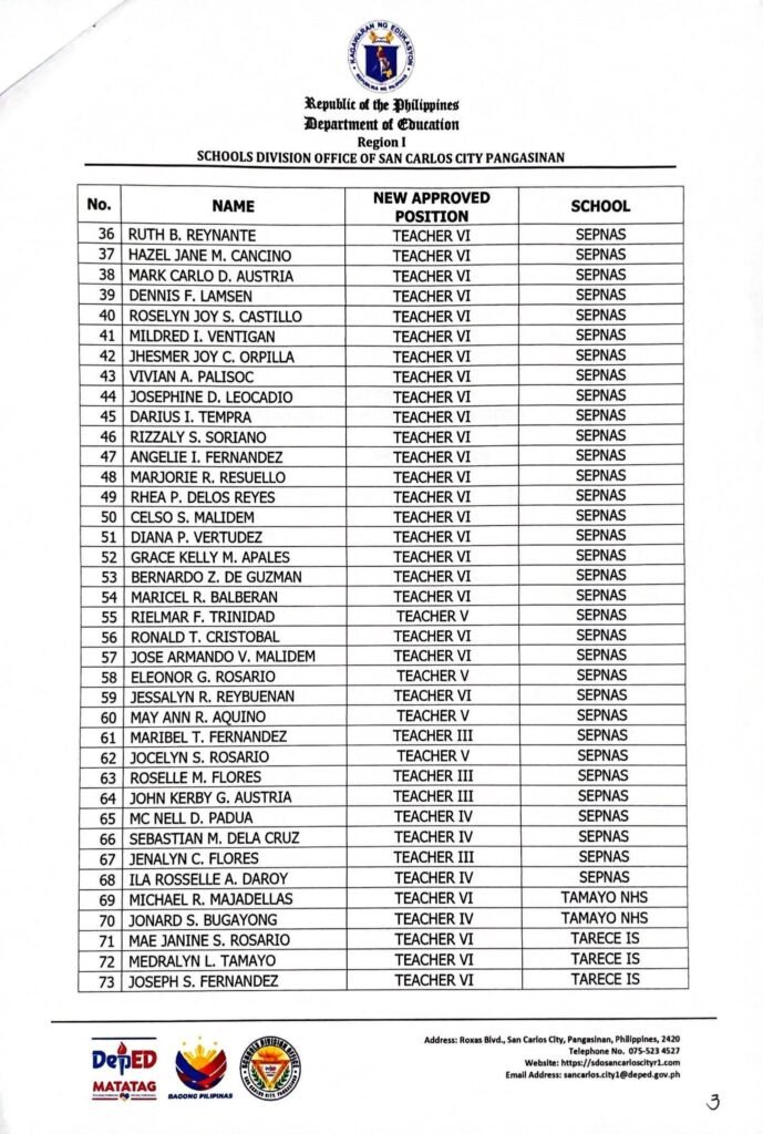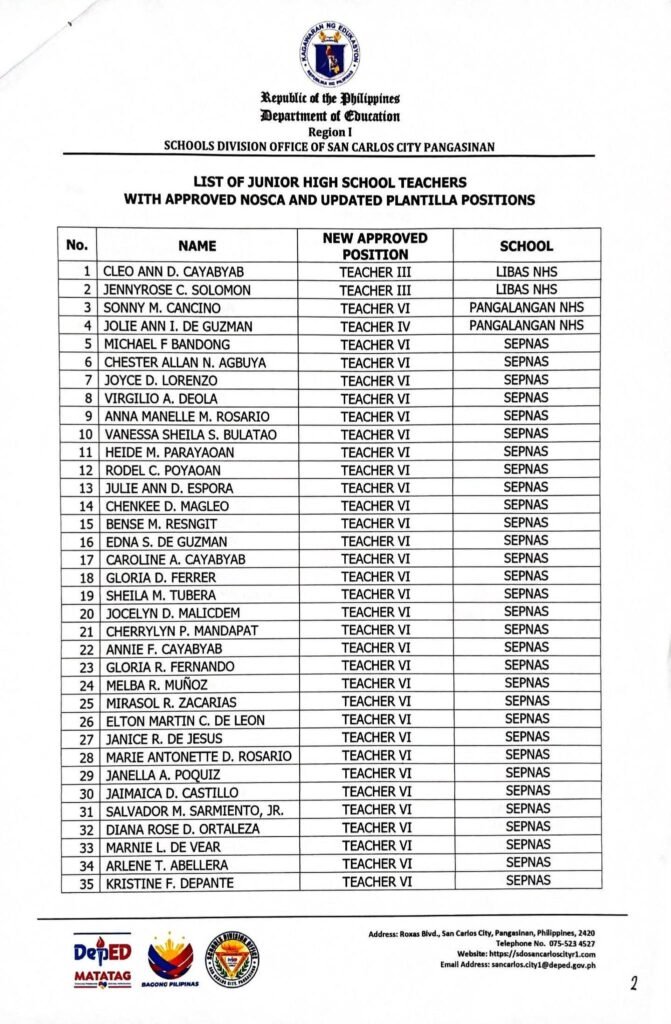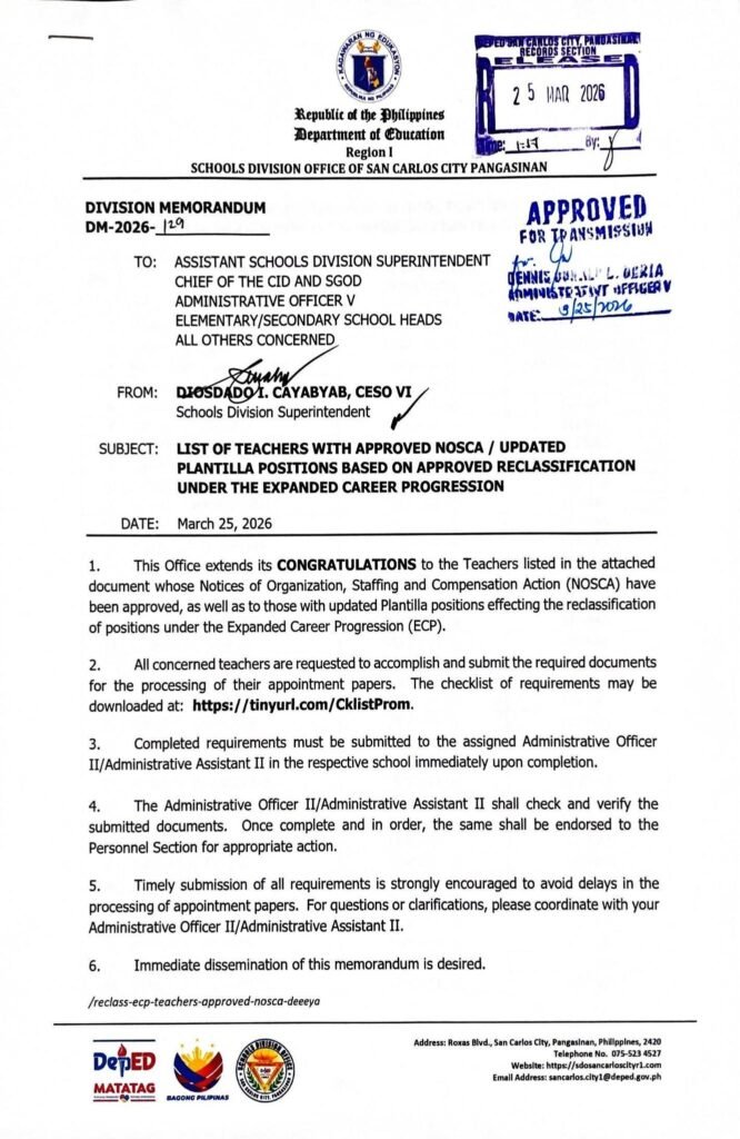 • Division Memorandum No. 129 s, 2026 – LIST OF TEACHERS WITH APPROVED NOSCA / UPDATED PLANTILLA POSITIONS BASED ON APPROVED RECLASSIFICATION UNDER THE EXPANDED CAREER PROGRESSION