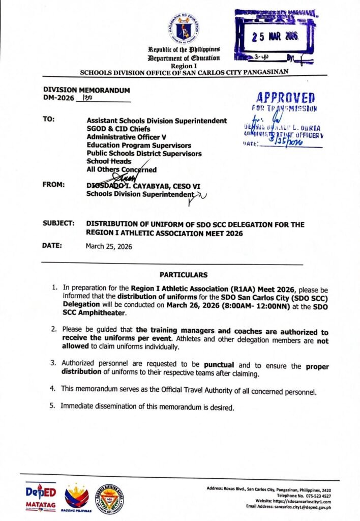 Division Memorandum No. 130 s, 2026 – DISTRIBUTION OF UNIFORM OF SDO SCC DELEGATION FOR THE REGION I ATHLETIC ASSOCIATION MEET 2026