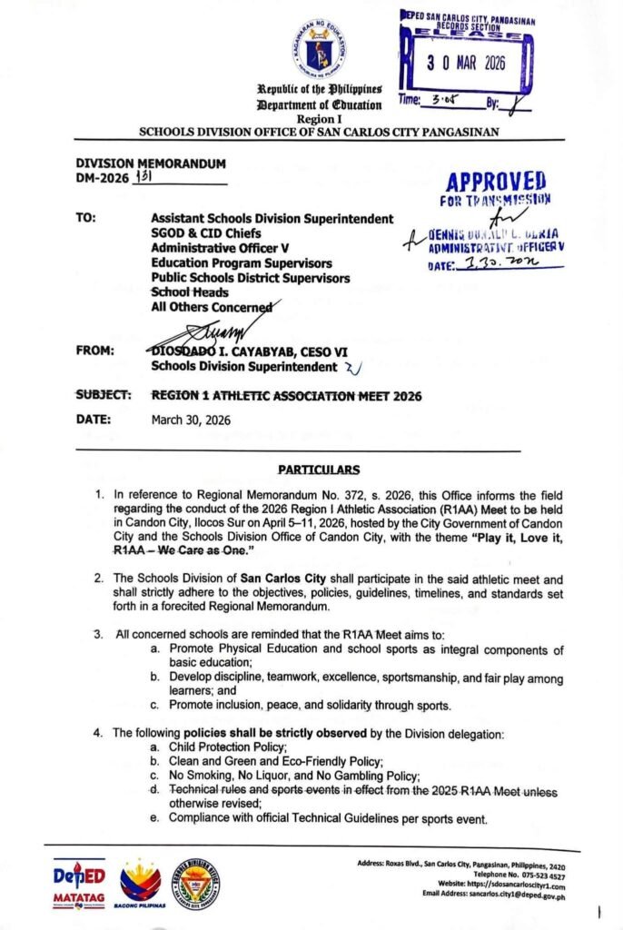 • Division Memorandum No. 131 s, 2026 – REGION 1 ATHLETIC ASSOCIATION MEET 2026