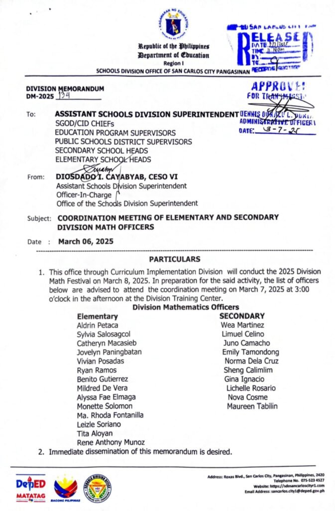 Division Memorandum No. 134 s, 2025 – Coordination Meeting of Elementary and Secondary Division Math Officers