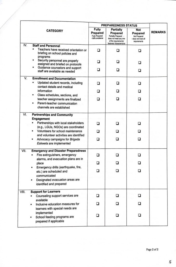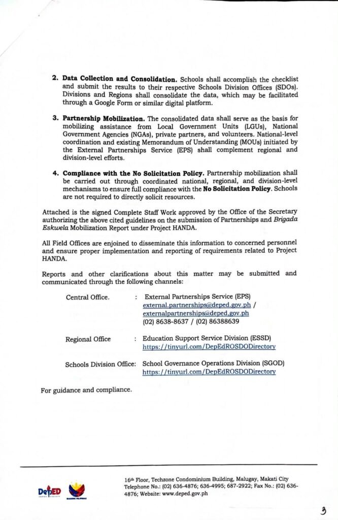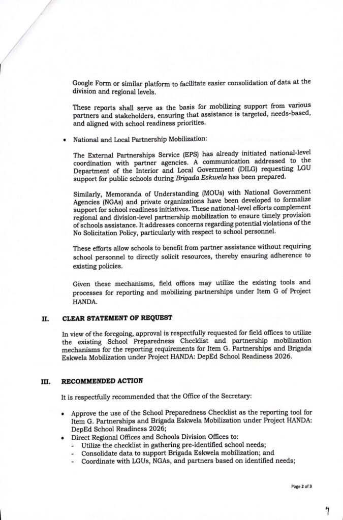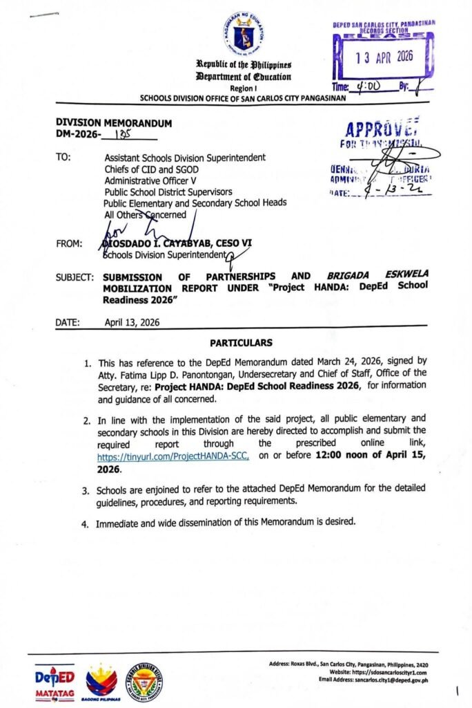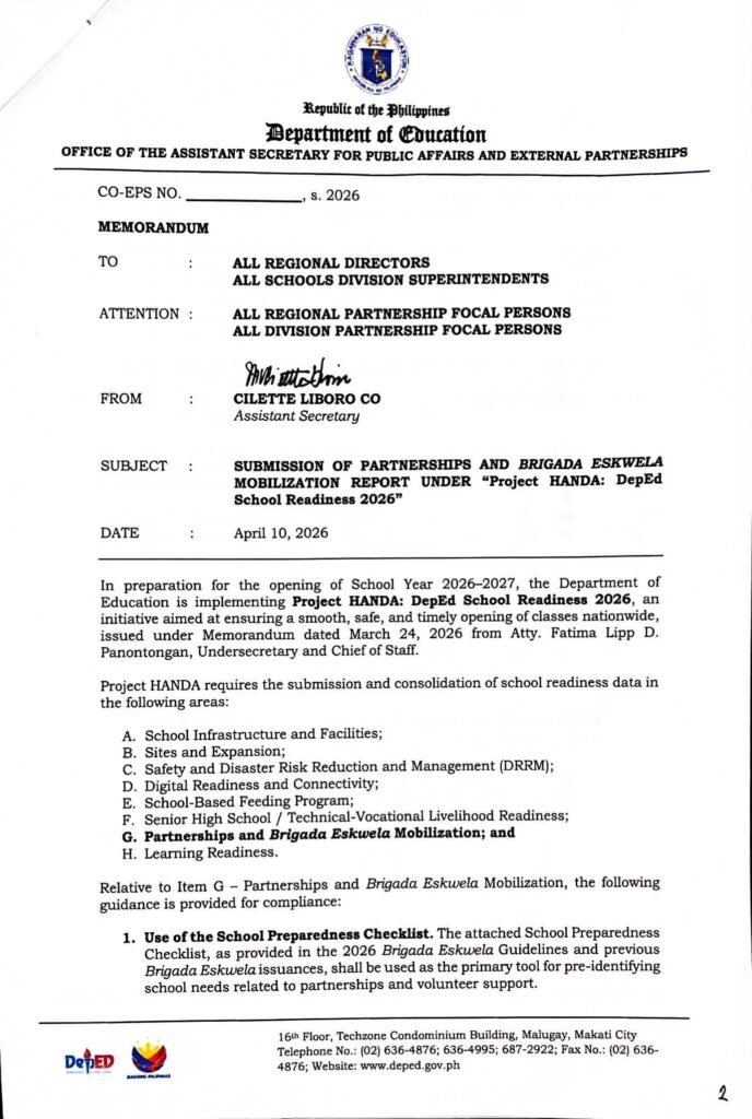 • Division Memorandum No. 135 s, 2026 – SUBMISSION OF PARTNERSHIPS AND BRIGADA ESKWELA MOBILIZATION REPORT UNDER “Project HANDA:” DepEd School Readiness 2026″