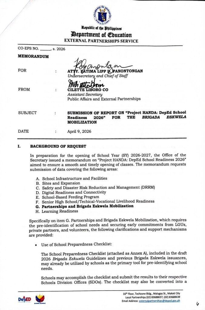 Division Memorandum No. 135 s, 2026 – SUBMISSION OF PARTNERSHIPS AND BRIGADA ESKWELA MOBILIZATION REPORT UNDER “Project HANDA:” DepEd School Readiness 2026″