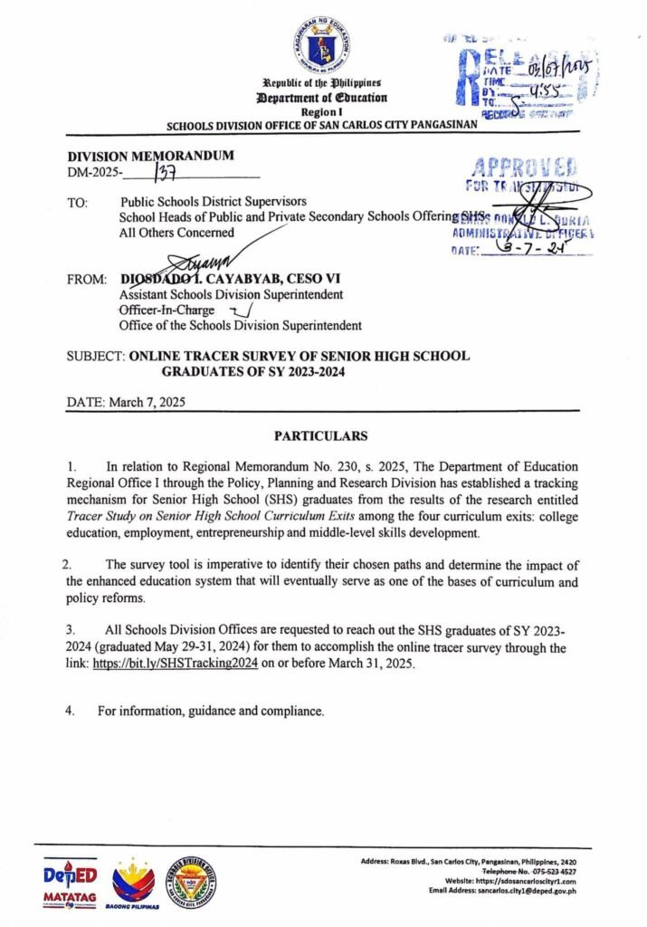 Division Memorandum No. 137 s, 2025 – ONLINE TEACHER SURVEY OF SENIOR HIGH SCHOOL GRADUATES OF SY 2023-2024