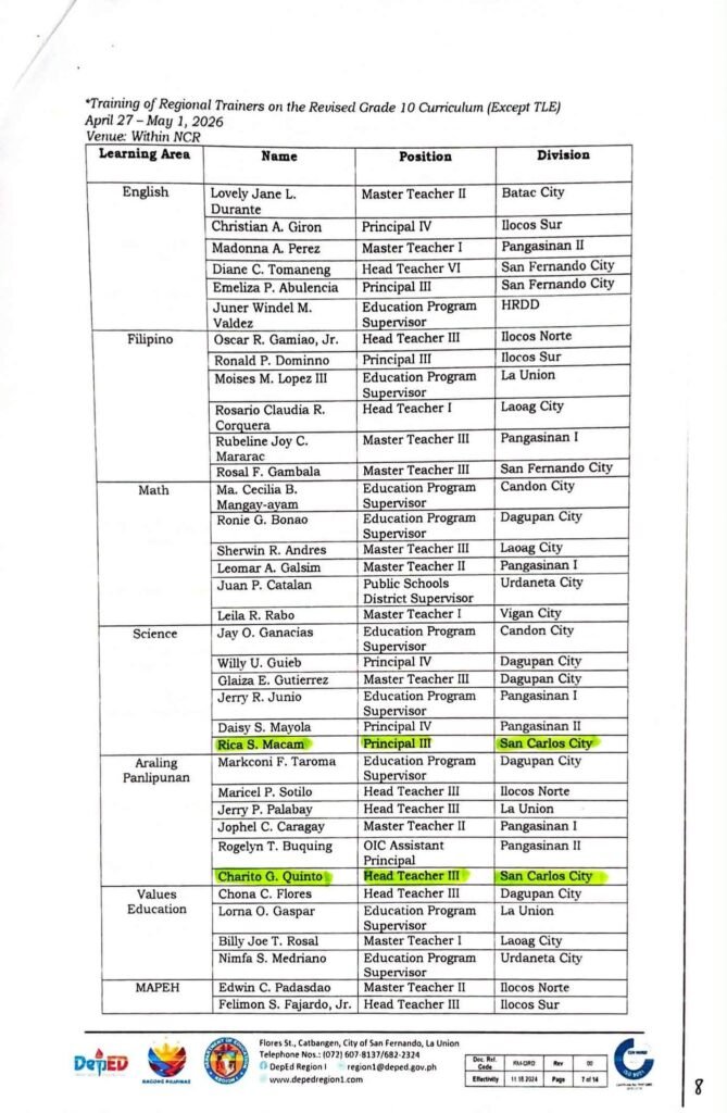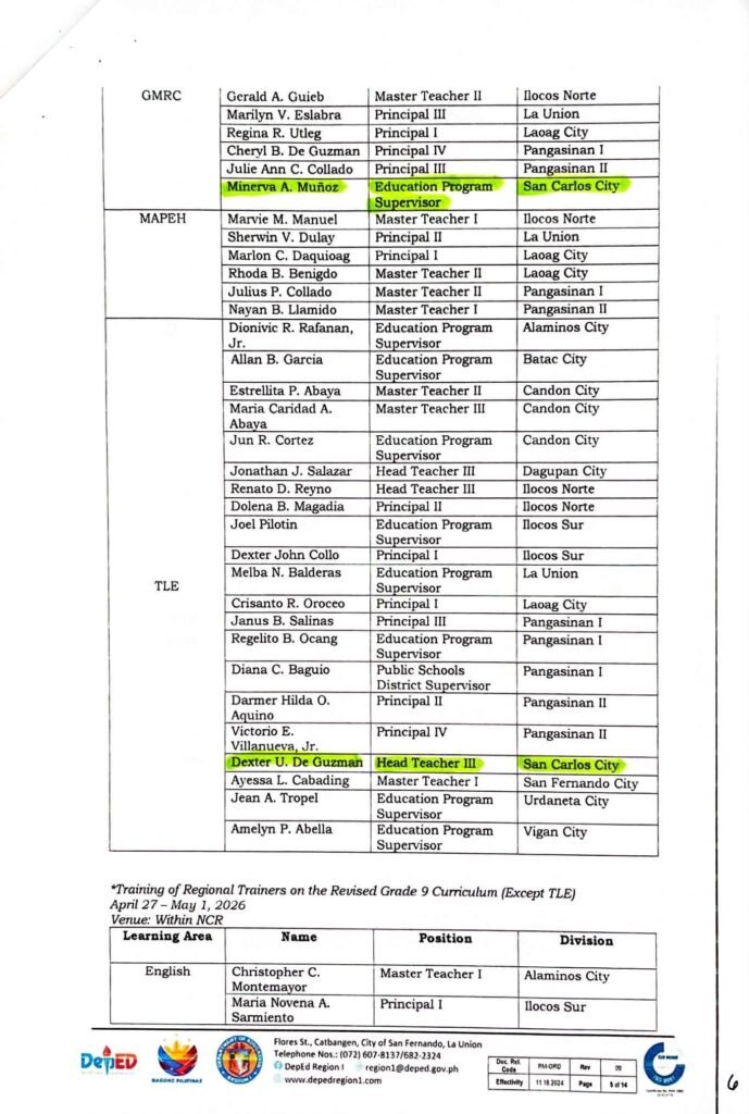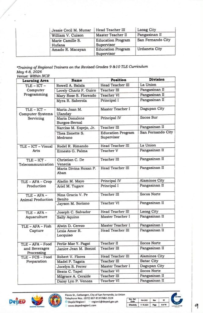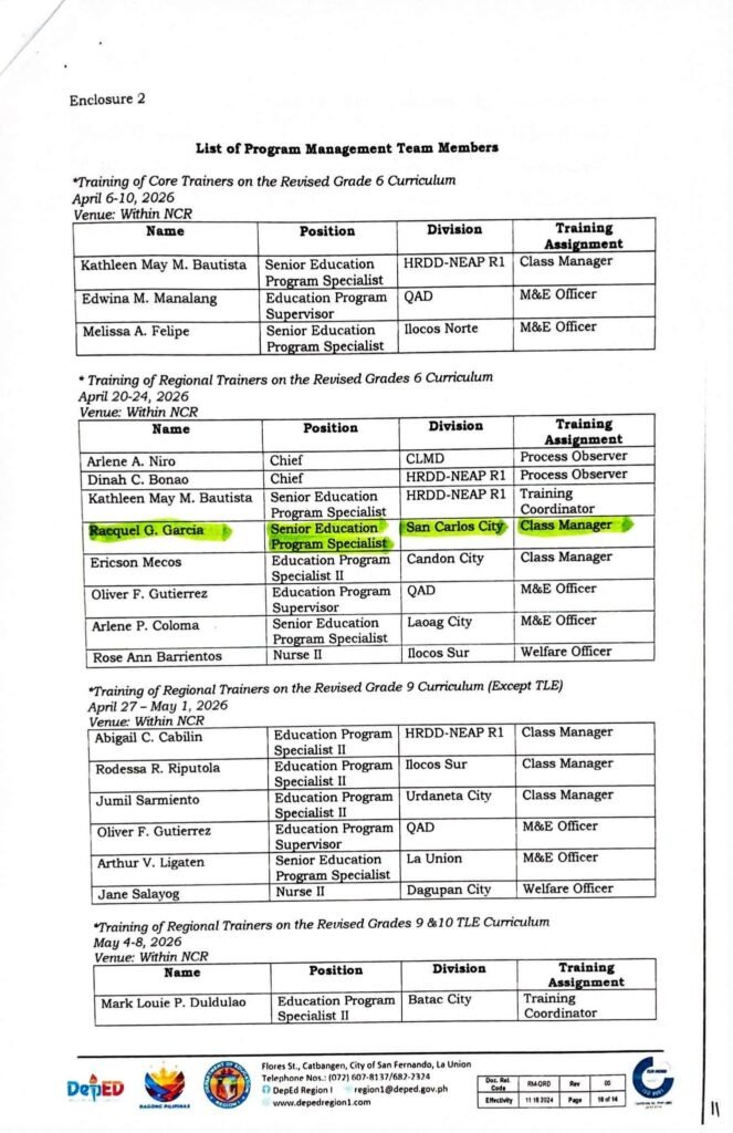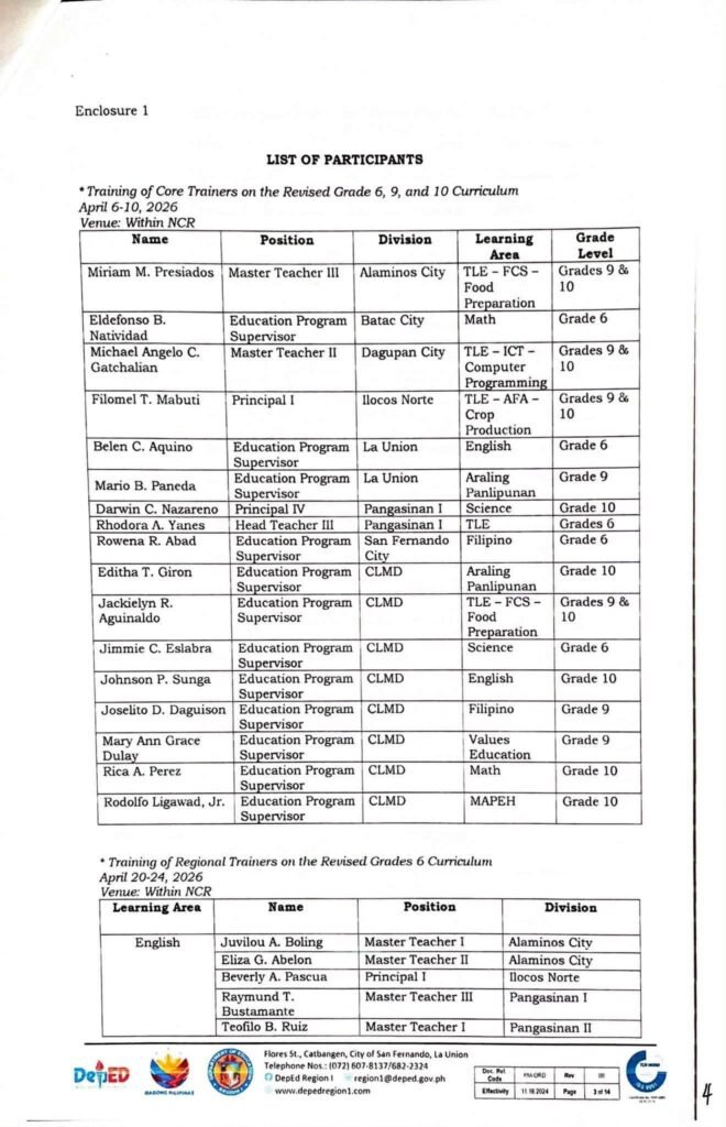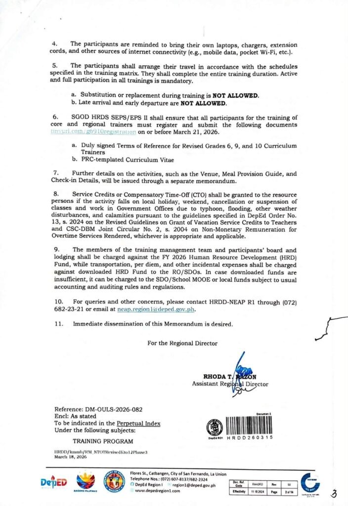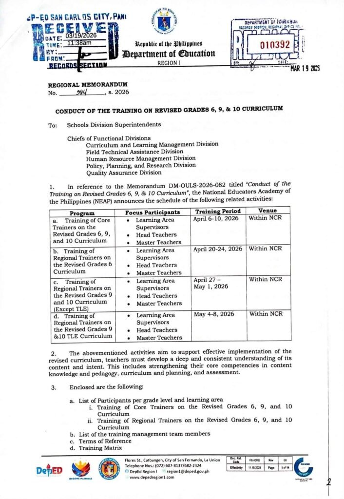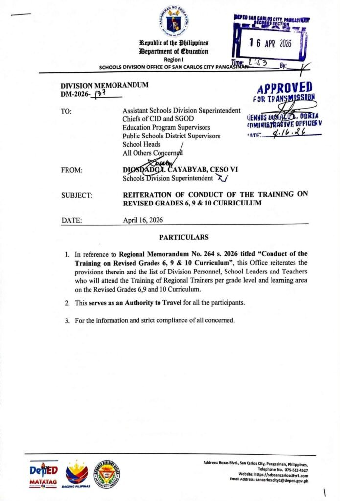 • Division Memorandum No. 137 s, 2026 – REITERATION OF CONDUCT OF THE TRAINING ON REVISED GRADES 6, 9 & 10 CURRICULUM
