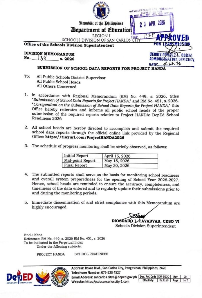 Division Memorandum No. 138 s, 2026 – SUBMISSION OF SCHOOL DATA REPORTS FOR PROJECT HANDA