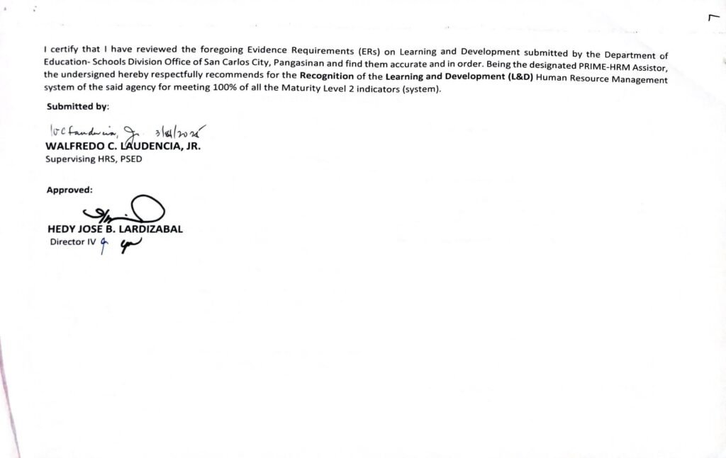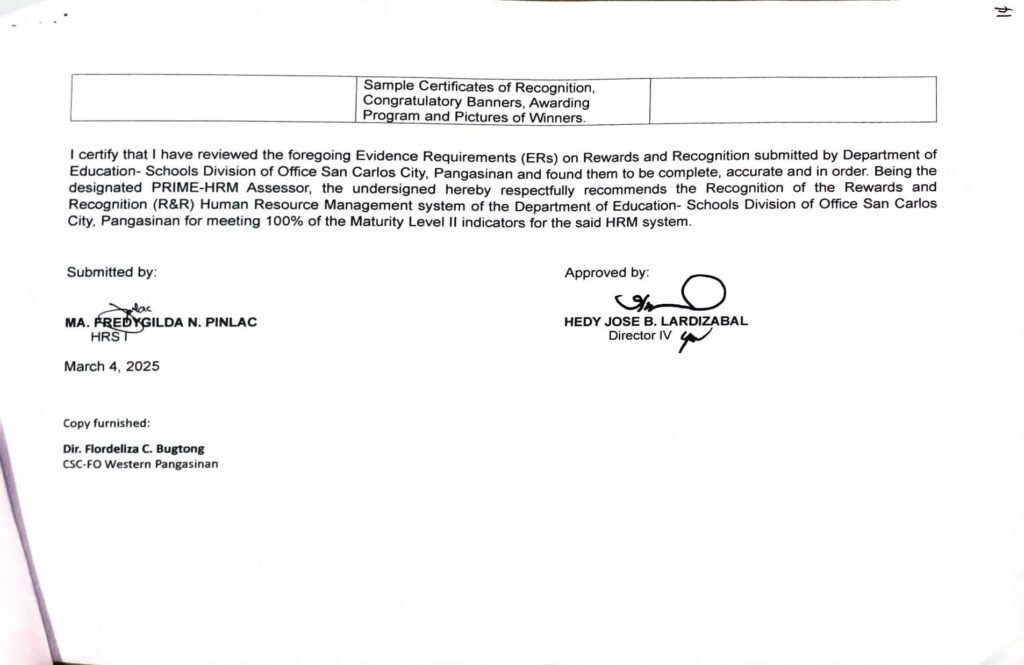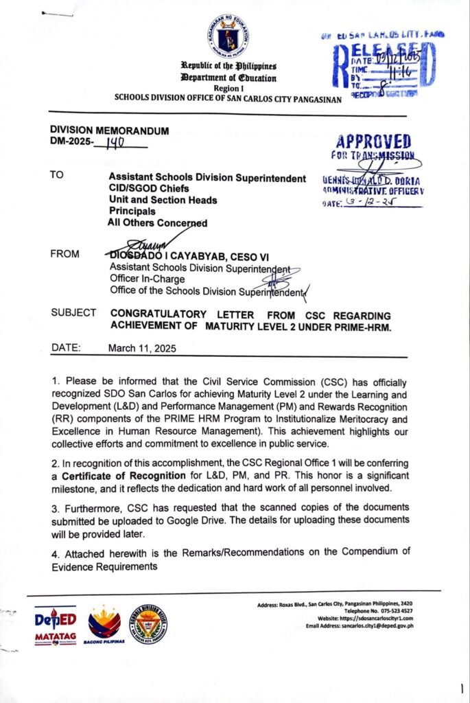 Division Memorandum No. 140 s, 2025 – CONGRATULATORY LETTER FROM CSC REGARDING ACHIEVEMENT OF MATURITY LEVEL 2 UNDER PRIME-HRM