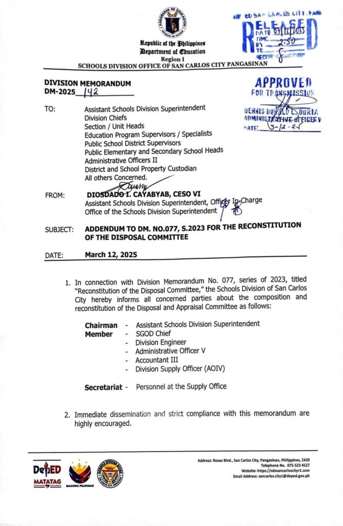 Division Memorandum No. 142 s, 2025 – ADDENDUM TO DM. NO.077, S.2023 FOR THE RECONSTITUTION OF THE DISPOSAL COMMITTEE