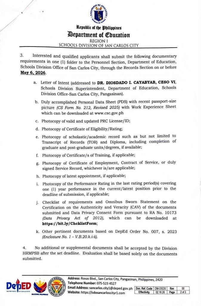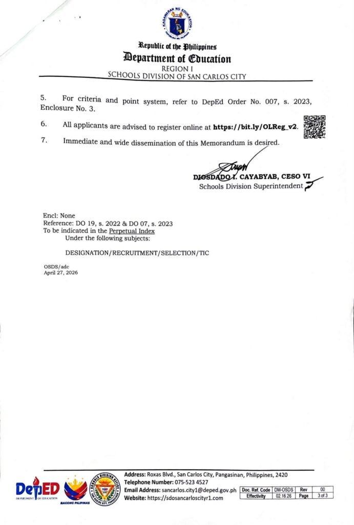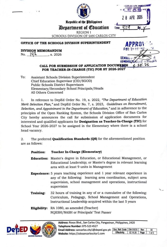 Division Memorandum No. 142 s, 2026 – CALL FOR SUBMISSION OF APPLICATION OF DOCUMENTS FOR TEACHER-IN-CHARGE (TIC) FOR SY 2026-2027