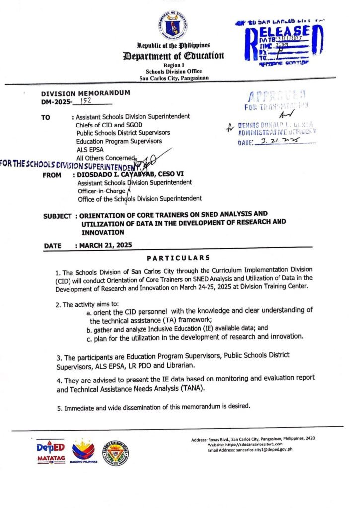 Division Memorandum No. 152 s, 2025 – ORIENTATION OF CORE TRAINERS ON SNED ANALYSIS AND UTILIZATION OF DATA IN THE DEVELOPMENT OF RESEARCH AND INNOVATION
