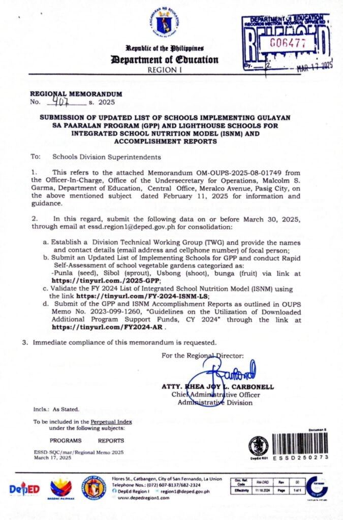 Division Memorandum No. 160 s, 2025 – Submission of Gulayan sa Paaralan (GPP) and Integrated School Nutritional Model (ISNM) Accomplishment Report for FY 2025