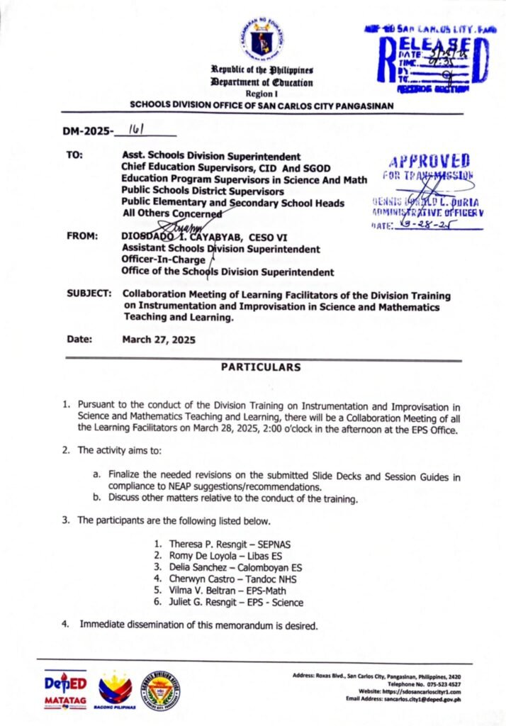 Division Memorandum No. 161 s, 2025 – Collaboration Meeting of Learning Facilitators of the Division Training on Instrumentation and Improvisation in Science and Mathematics Teaching and Learning