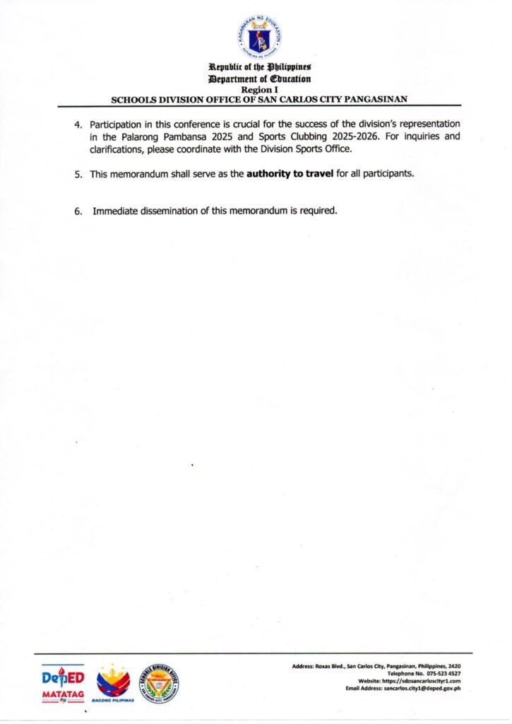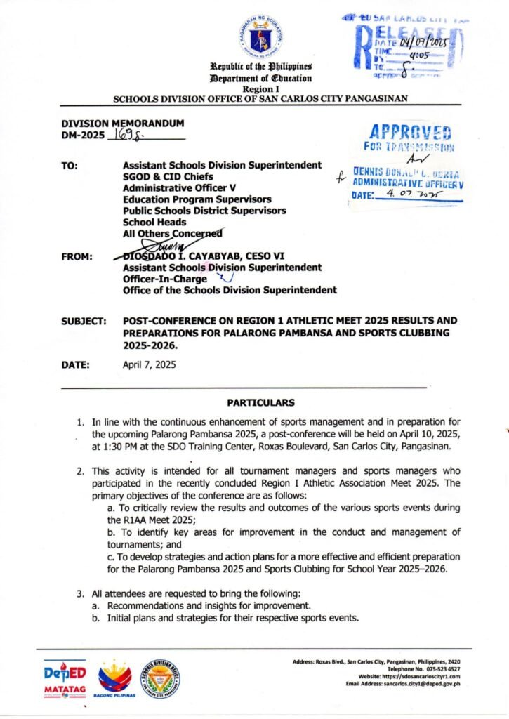Division Memorandum No. 169 s, 2025 – POST-CONFERENCE ON REGION 1 ATHLETIC MEET 2025 RESULTS AND PREPARATIONS FOR PALARONG PAMBANSA AND SPORTS CLUBBING 2025-2026