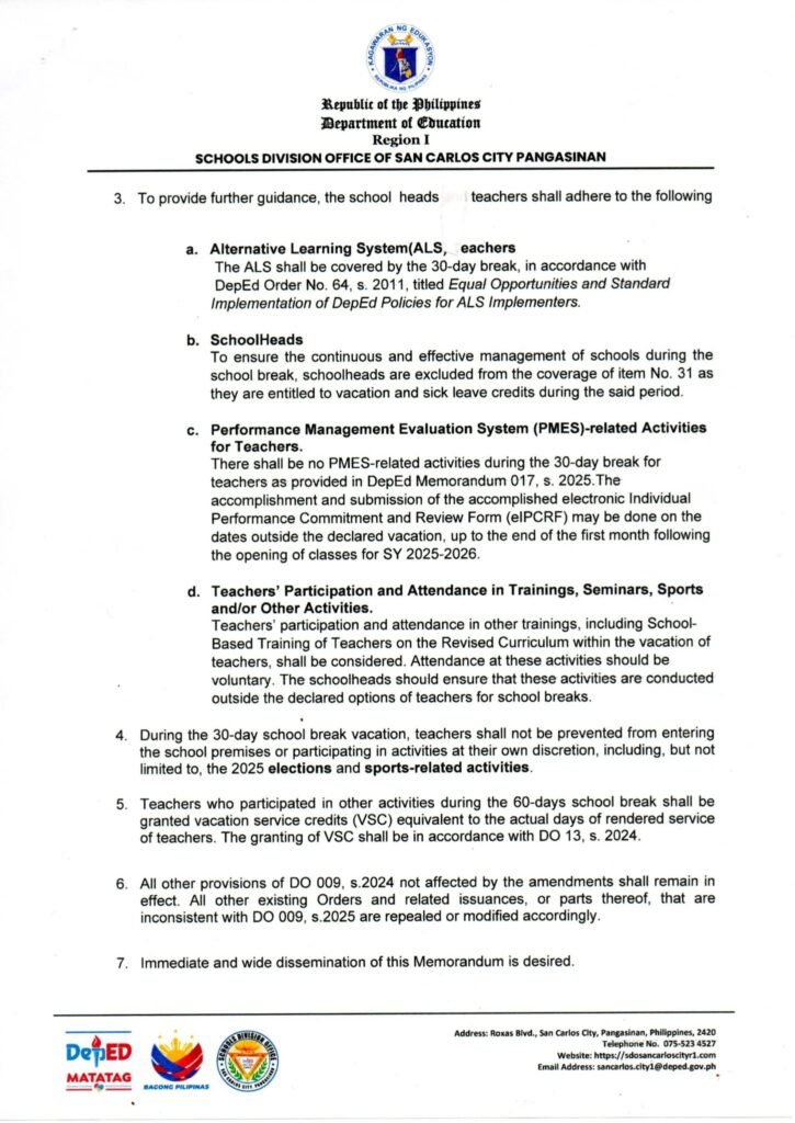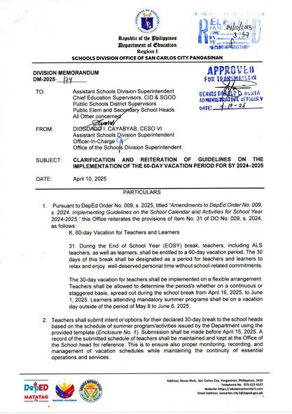 Division Memorandum No. 174 s, 2025 – CLARIFICATION AND REITERATION OF GUIDELINES ON THE IMPLEMENTATION OF THE 60-DAY VACATION PERIOD FOR SY 2024-2025
