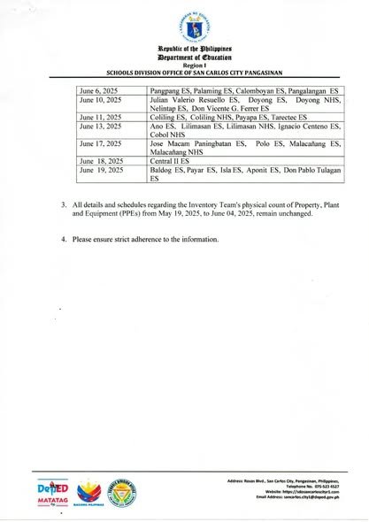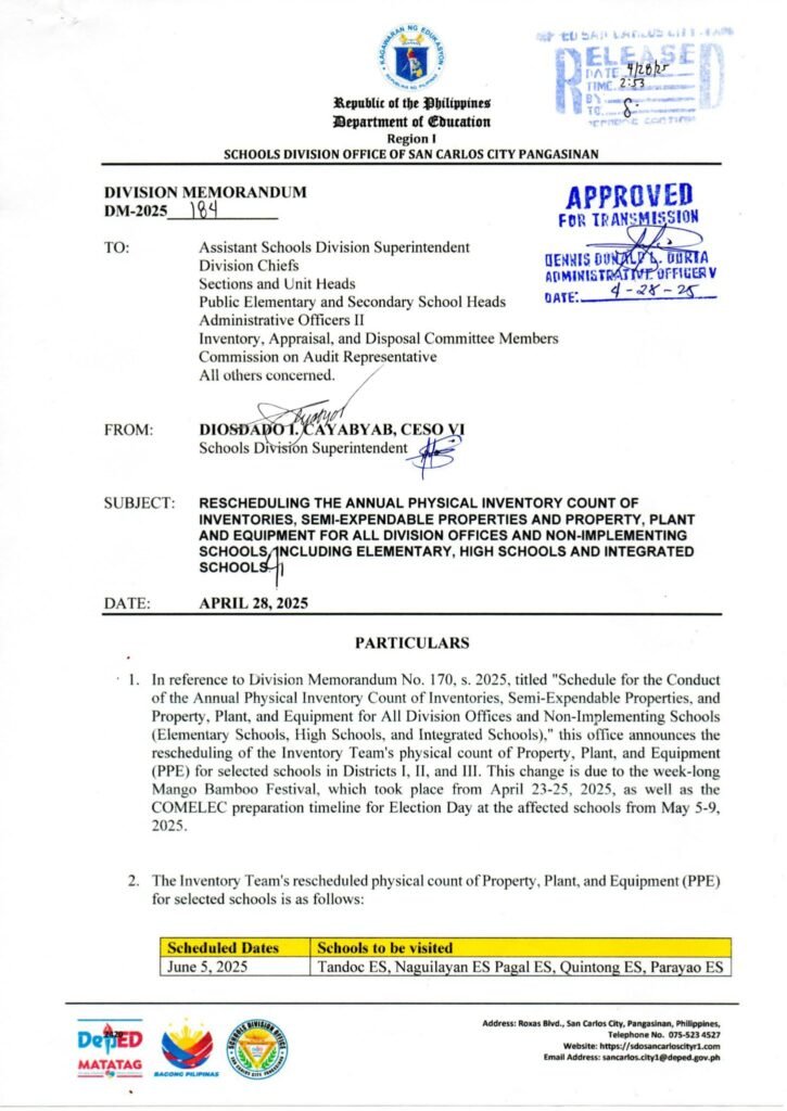 Division Memorandum No. 184 s, 2025 – RESCHEDULING THE ANNUAL PHYSICAL INVENTORY COUNT OF INVENTORIES, SEMI-EXPENDABLE PROPERTIES AND PROPERTY, PLANT AND EQUIPMENT FOR ALL DIVISION OFFICES AND NON-IMPLEMENTING SCHOOLS