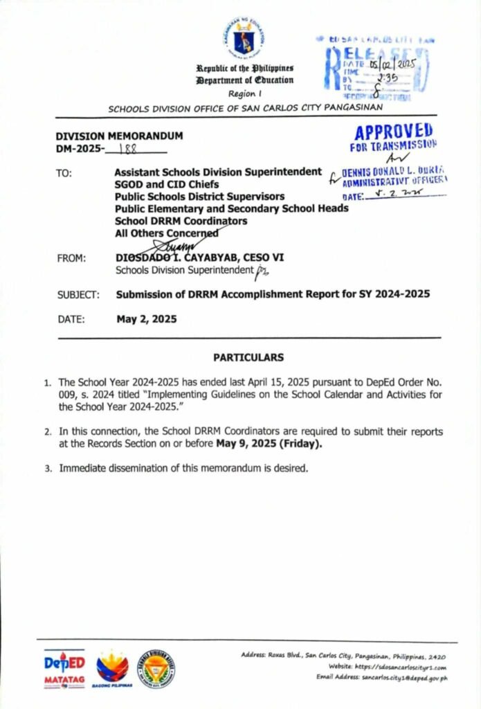 Division Memorandum No. 188 s, 2025 – Submission of DRRM Accomplishment Report for SY 2024-2025