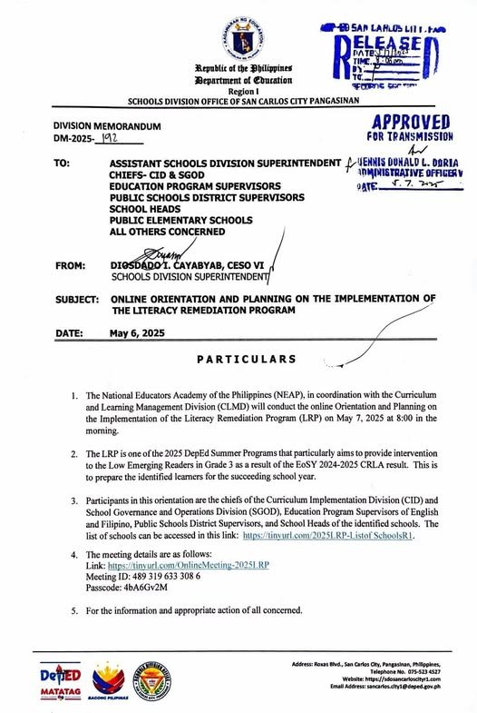 Division Memorandum No. 192 s, 2025 – ONLINE ORIENTATION AND PLANNING ON THE IMPLEMENTATION OF THE LITERACY REMEDIATION PROGRAM