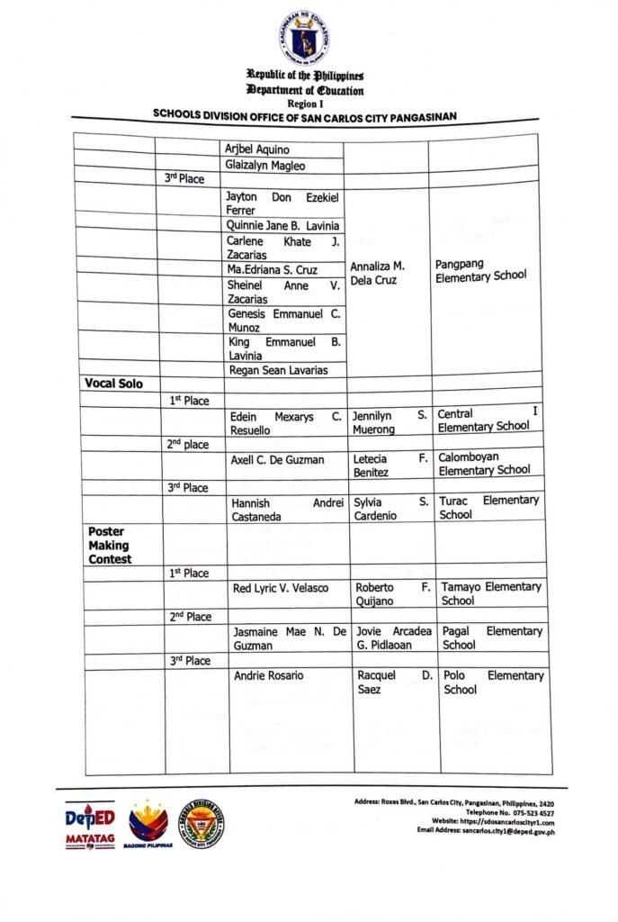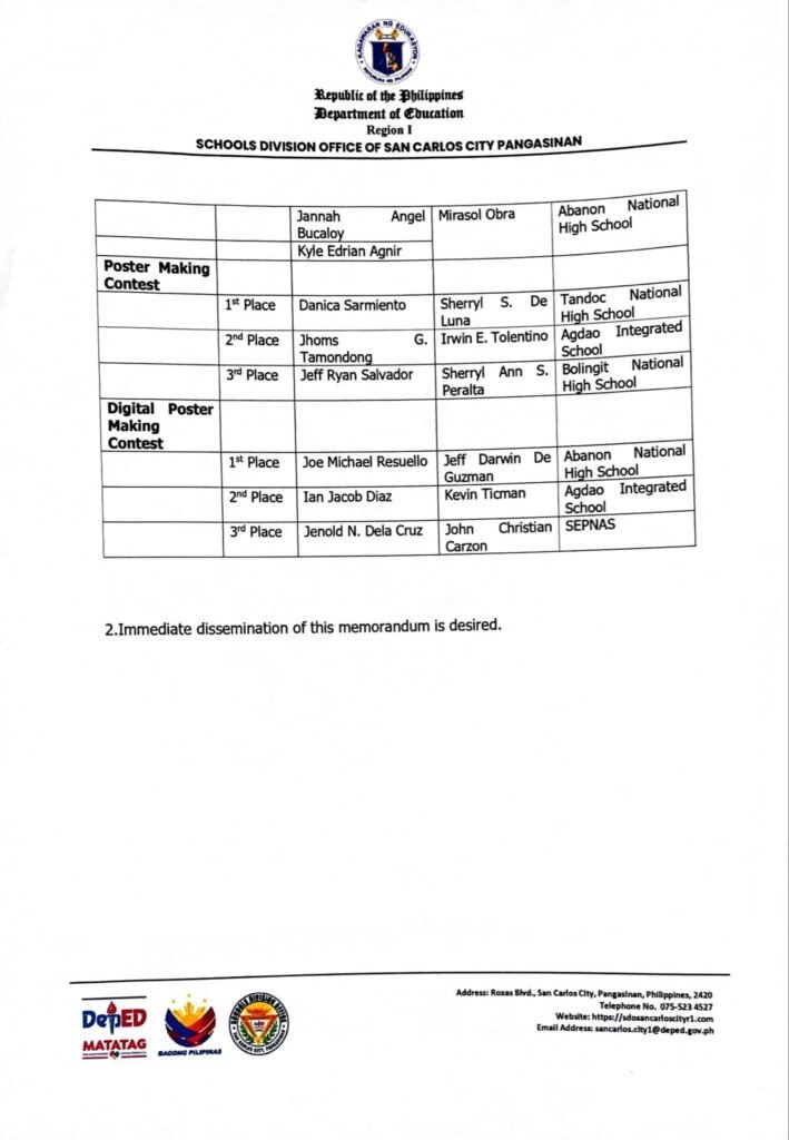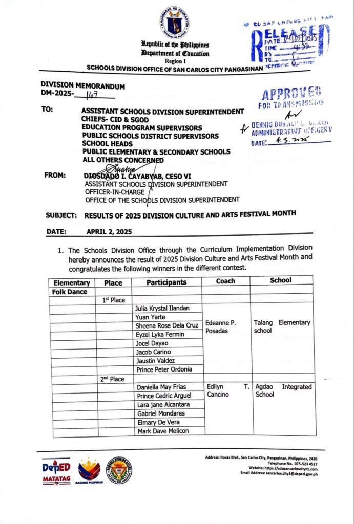 Division Memorandum No. 194 s, 2025 – RESULTS OF 2025 DIVISION CULTURE AND ARTS FESTIVAL MONTH