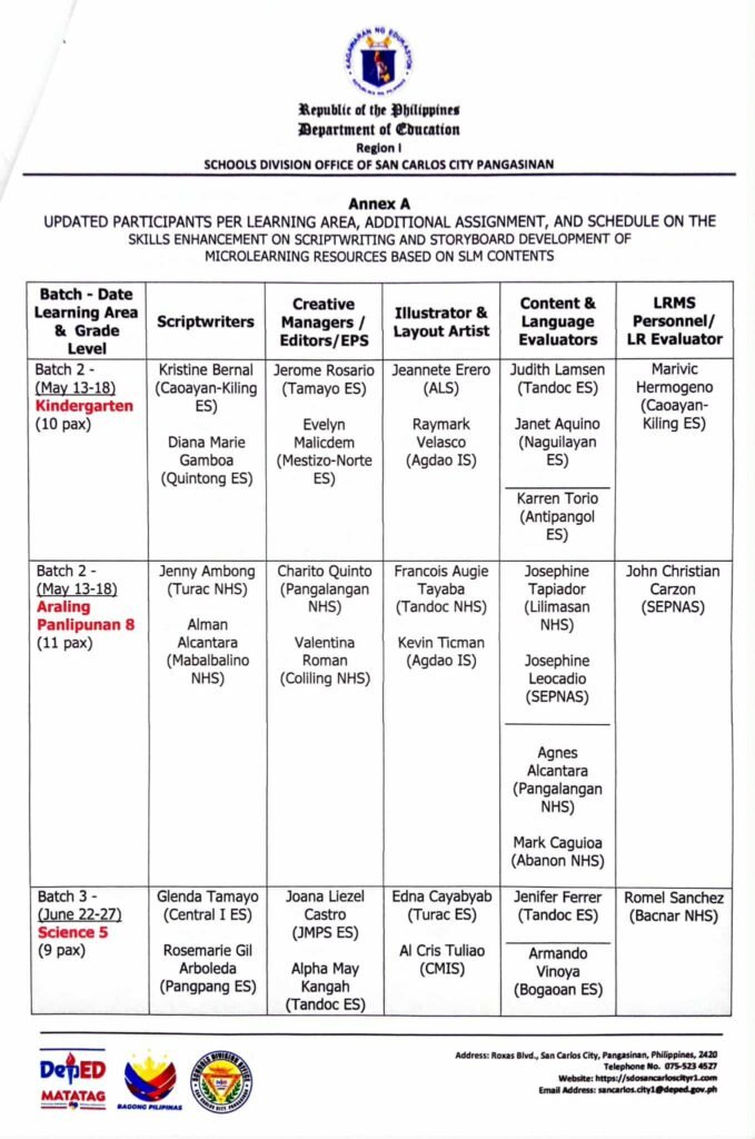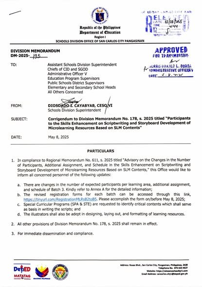 Division Memorandum No. 195 s, 2025 – Corrigendum to Division Memorandum No. 178, s. 2925 titled “Participants to the Skills Enhancement on Scriptwriting and Storyboard Development of Microlearning Resources Based on SLM Contents”