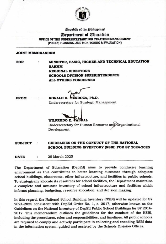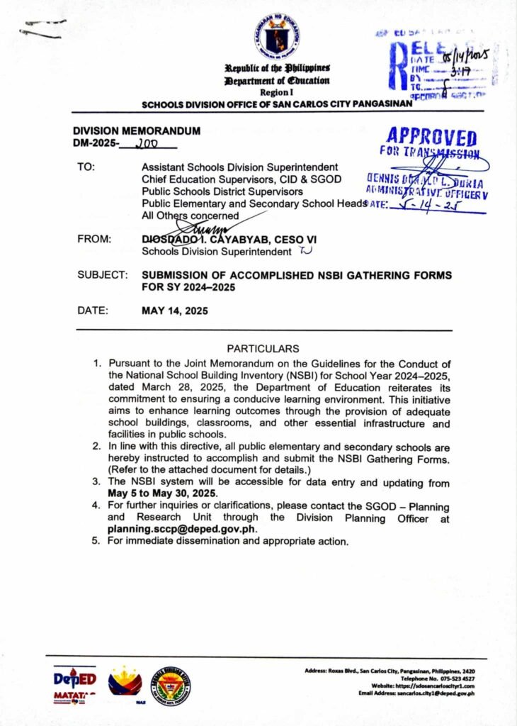 Division Memorandum No. 200 s, 2025 – Submission of Accomplished NSBI Gathering Forms for SY 2024-2025