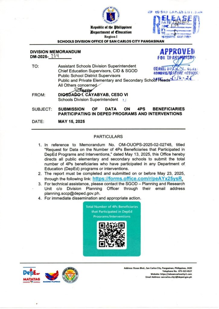 Division Memorandum No. 204 s, 2025 – SUBMISSION OF DATA ON 4Ps BENEFICIARIES PARTICIPATING IN DEPED PROGRAMS AND INTERVENTIONS