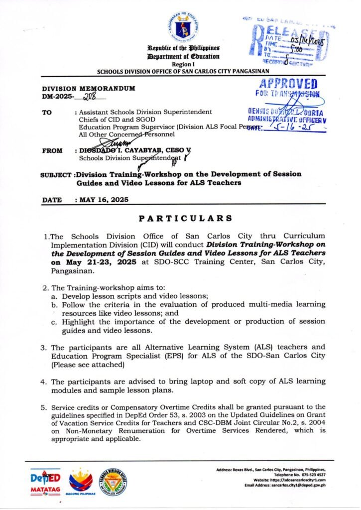 Division Memorandum No. 208 s, 2025 – DIVISION TRAINING-WORKSHOP ON THE DEVELOPMENT OF SESSION GUIDES AND VIDEO LESSONS FOR ALS TEACHERS