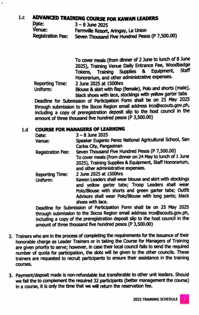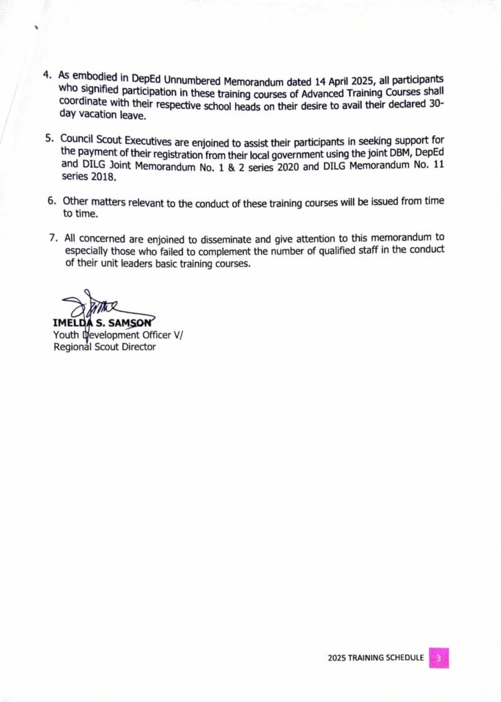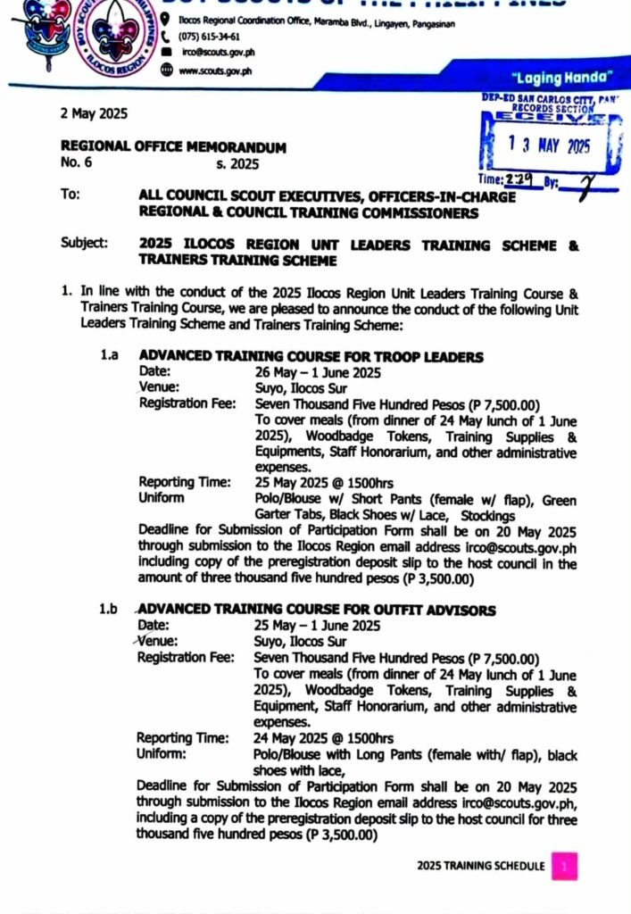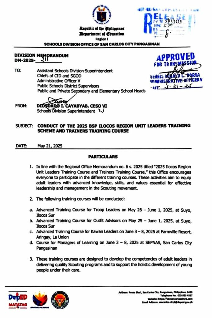 Division Memorandum No. 211 s, 2025 – Conduct of the 2025 BSP Ilocos Region Unit Leaders Training Scheme and Trainers Training Course