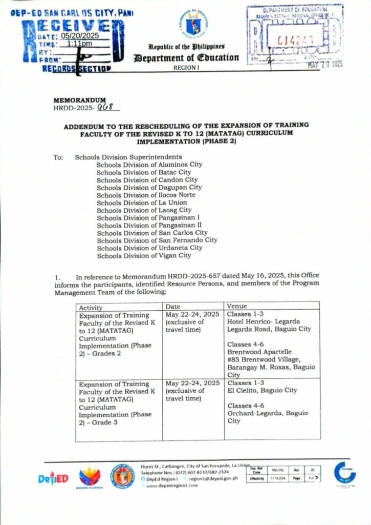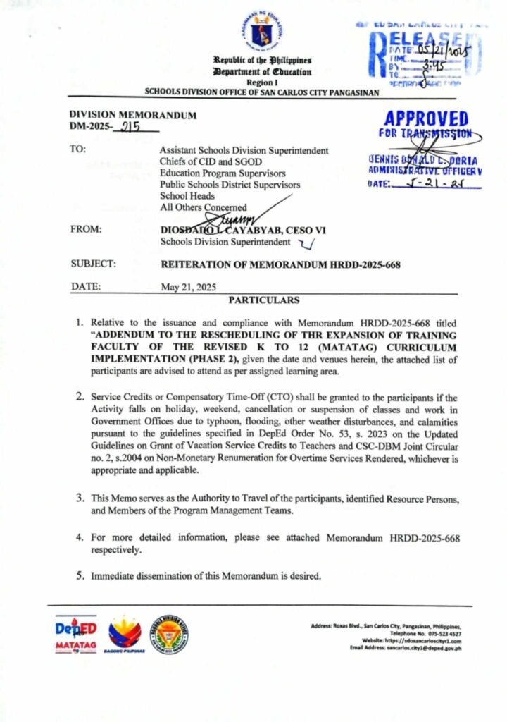 Division Memorandum No. 215 s, 2025 – Reiteration of Memorandum HRDD-2025-668