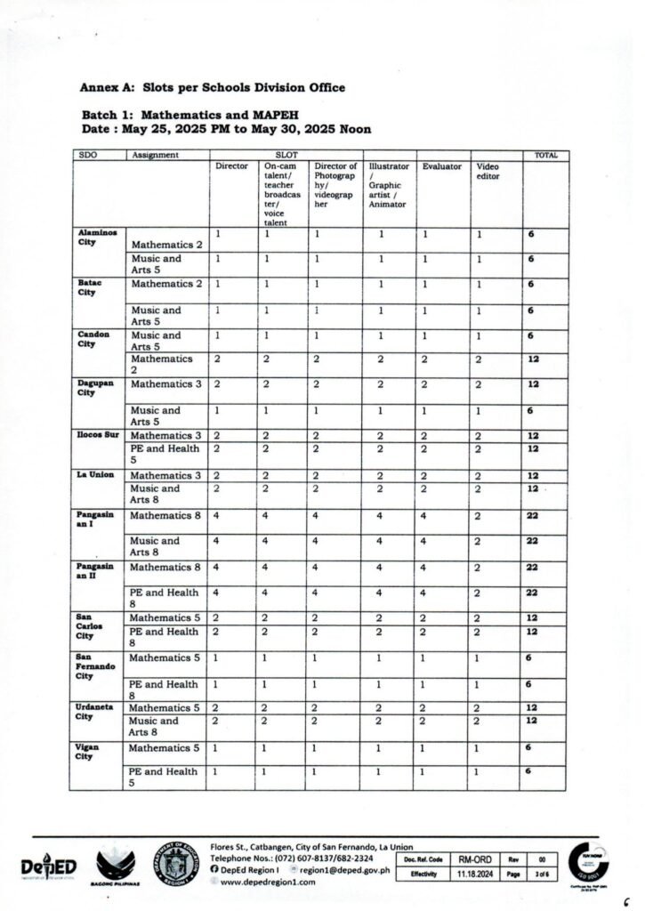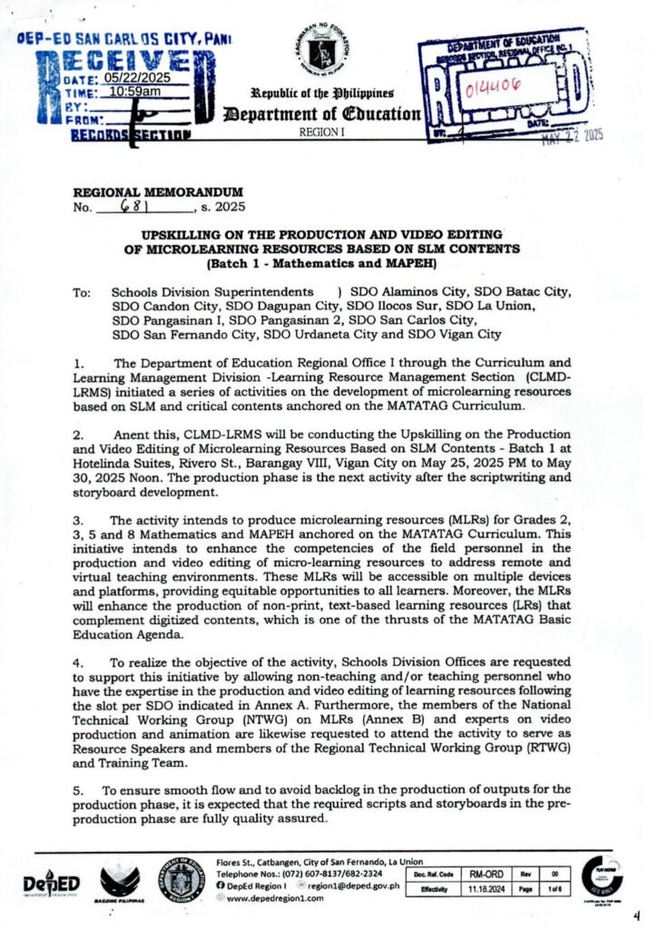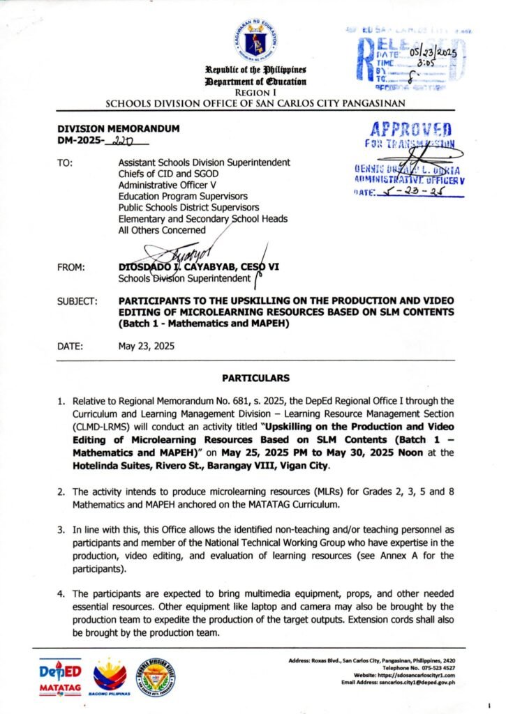 Division Memorandum No. 220 s, 2025 – PARTICIPANTS TO THE UPSKILLING ON THE PRODUCTION AND VIDEO EDITING OF MICROLEARNING RESOURCES BASED ON SLN CONTENTS (Batch 1 – Mathematics and MAPEH)