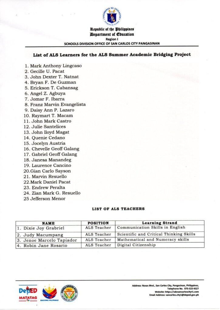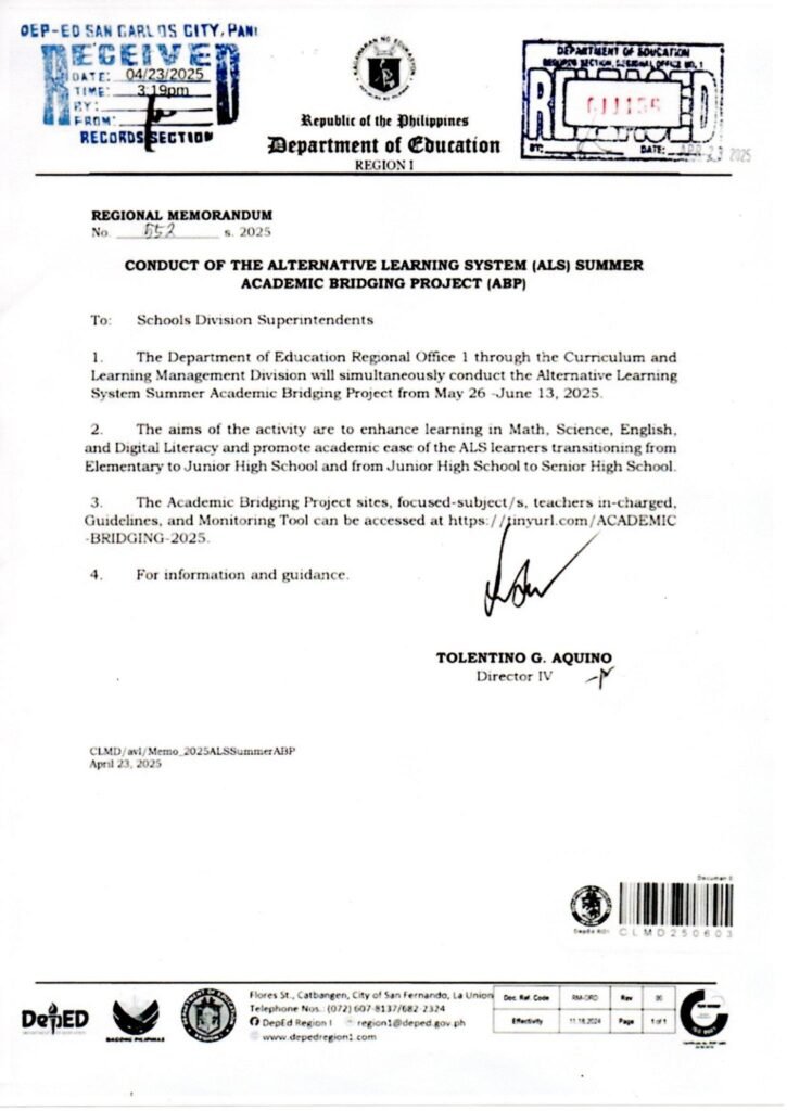 Division Memorandum No. 221 s, 2025 – Conduct of the Alternative Learning System (ALS) Summer Academic Bridging Program