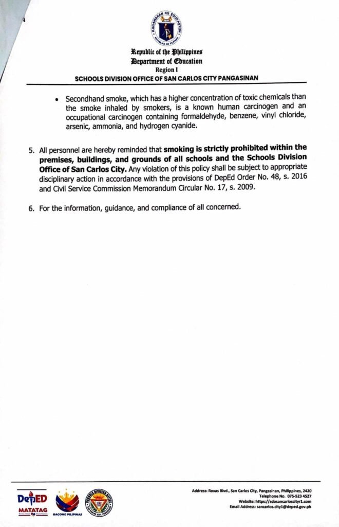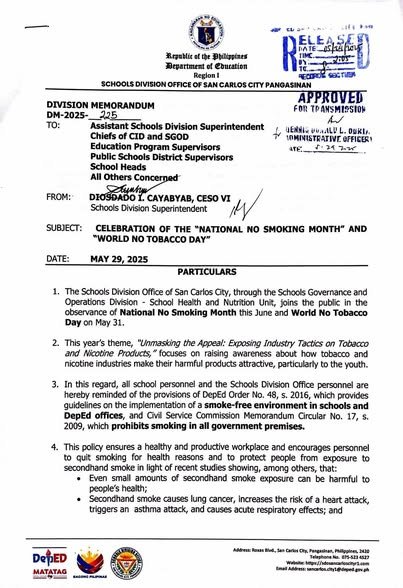 Division Memorandum No. 225 s, 2025 – CELEBRATION OF THE “NATIONAL NO SMOKING MONTH” AND “WORLD NO TOBACCO DAY”
