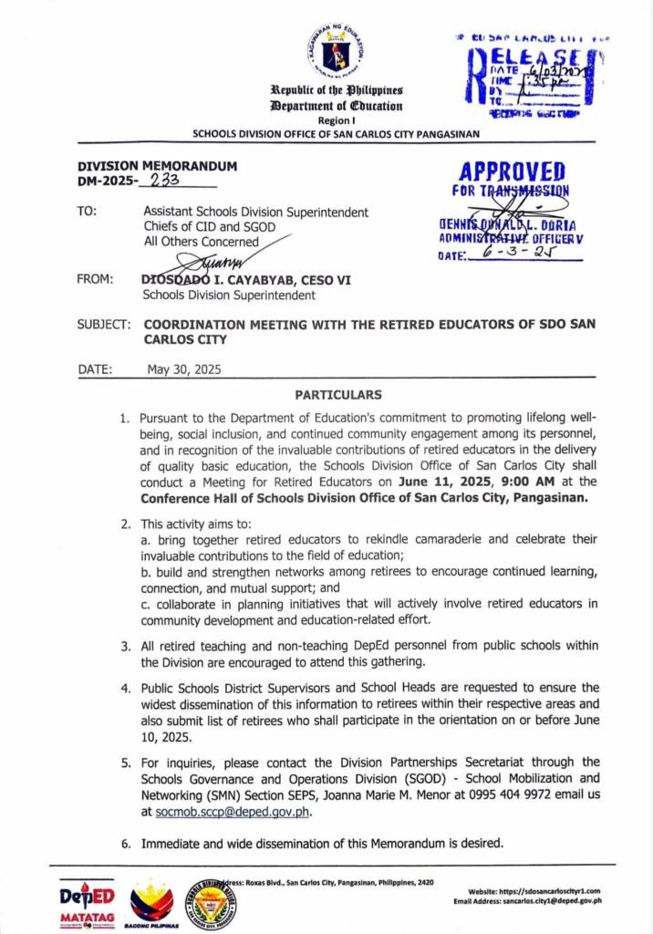 Division Memorandum No. 233 s, 2025 – Coordination Meeting with the Retired Educators of SDO San Carlos City