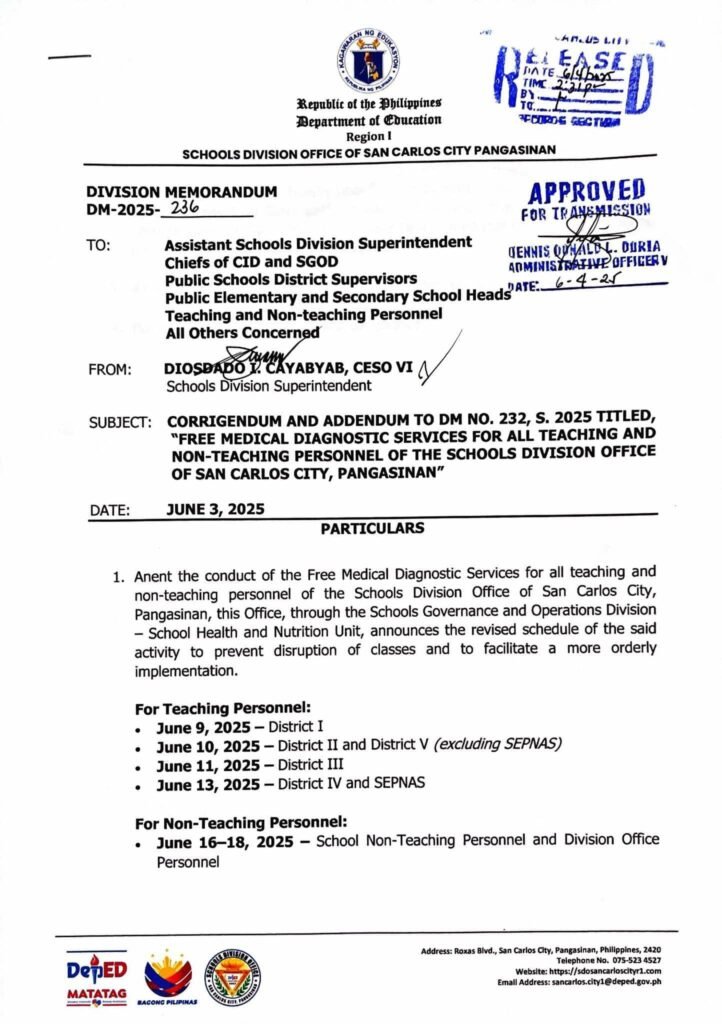 Division Memorandum No. 236 s, 2025 – CORRIGENDUM AND ADDENDUM TO DM 232, S. 2025 TITLED, “FREE MEDICAL DIAGNOSTICS SERVICE FOR ALL TEACHING AND NON-TEACHING PERSONNEL OF THE SCHOOLS DIVISION OFFICE OF SAN CARLOS CITY, PANGASINAN”