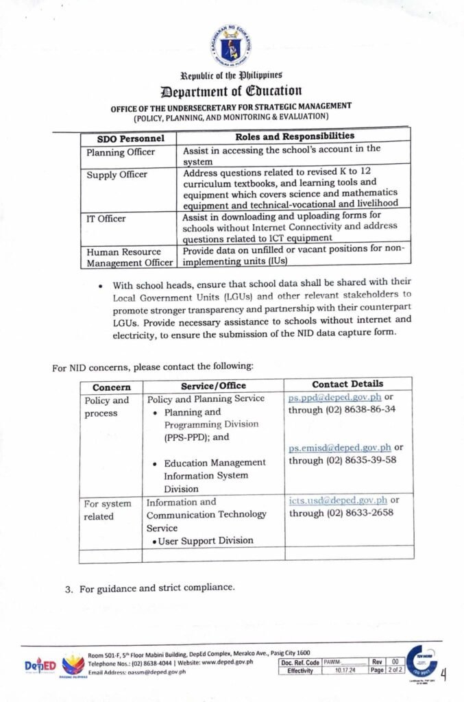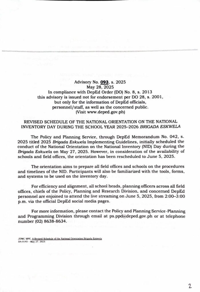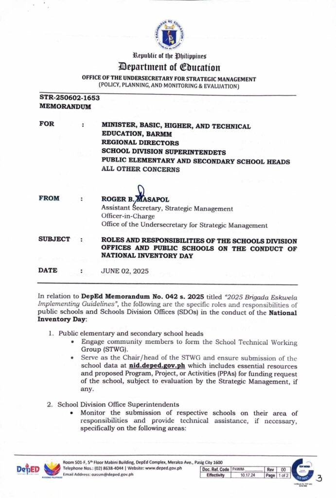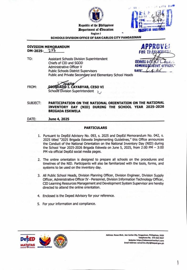 Division Memorandum No. 238 s, 2025 – PARTICIPATION ON THE NATIONAL ORIENTATION ON THE NATIONAL INVENTORY DAY (NID) DURING THE SCHOOL YEAR 2025-2026 BRIGADA ESKWELA