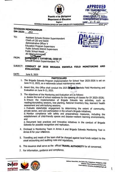 Division Memorandum No. 242 s, 2025 – CONDUCT OF 2025 BRIGADA ESKWELA FIELD MONITORING AND EVALUATION